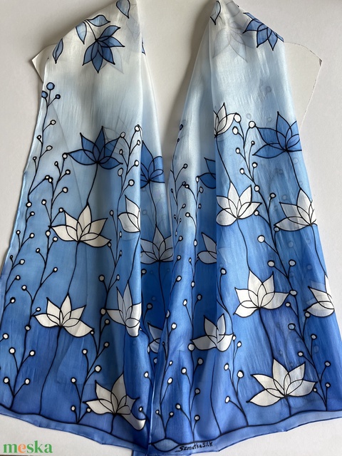 Királykék 100% selyem sál köszönő ajándék virágos átmenetes sál