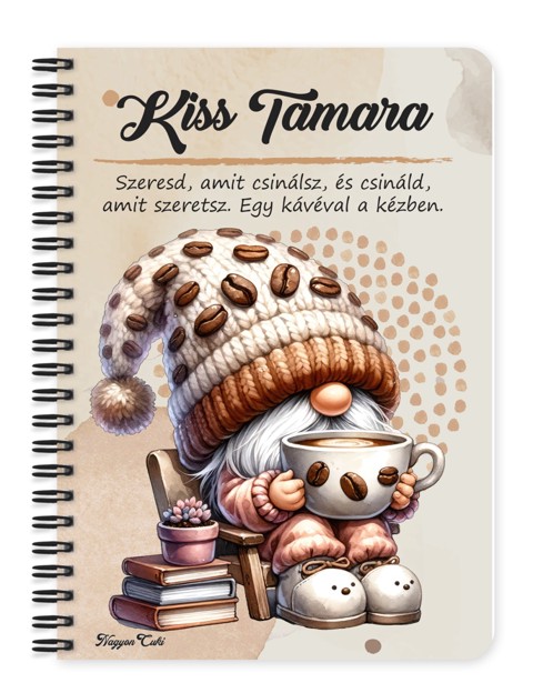 Névvel & Idézettel Kérhető - Cuki kávés manó könyvvel Mintás Füzet | Egyedi Ajándék Kávéimádóknak & Személyre Szabható Manós Füzet | nagyoncuki.hu Képzeld el, hogy a reggeli kávéd illata mellett ott lapul az asztalodon egy végtelenül cuki, személyre szabott füzet, aminek a borítóján a te neved és egy neked szóló, inspiráló üzenet köszönt! Ez a kávés manó mintás füzet nem csupán egy jegyzetfüzet – ő egy vidám társ a mindennapokhoz, egy motivációs lökés a borús reggeleken, és egy igazán szívhez szóló, egyedi ajándék minden kávérajongónak. Ez a kis cuki manó a gőzölgő kávéscsészéjével a hygge életérzést, a nyugodt reggeleket és a kreatív energiákat testesíti meg. Tökéletes választás, ha egy kis vidámságot és rendszert szeretnél csempészni a napjaidba. Legyen szó a napi teendők listájáról, egyetemi jegyzetekről vagy egy új projekt tervezéséről, ez a manós füzet garantáltan mosolyt csal az arcodra. A dizájn kedves és egyedi, így kiváló ajándék ötlet azoknak, akik imádják a kávét és a személyes meglepetéseket. Ezt a bájos füzetet mi magunk, a nagyoncuki.hu csapata terveztük, így biztos lehetsz benne, hogy egy igazán különleges, magyar dizájnnal készült darabbal leped meg szeretteidet vagy magadat! :)