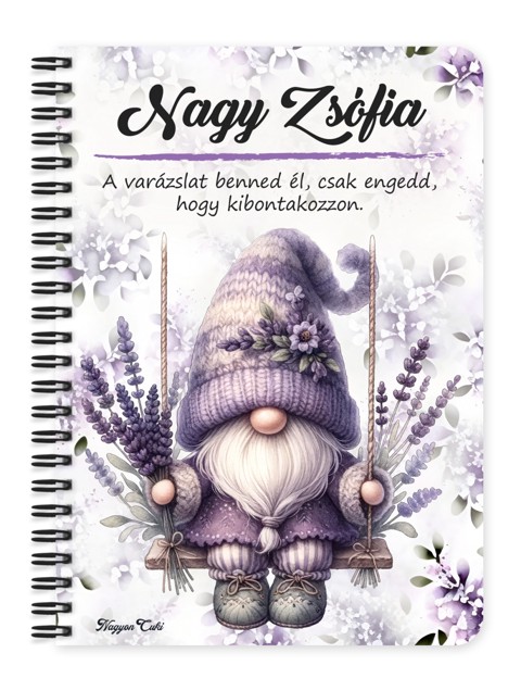 Névvel & Idézettel Kérhető - Hintázó Levendulás manó mintás Füzet | Egyedi Ajándék Kávéimádóknak & Személyre Szabható Manós Füzet | nagyoncuki.hu Képzeld el, ahogy egy hosszú nap után leülsz egy csendes sarokba, a levegőben finom levendulaillat száll, a kezedben pedig ez a gyönyörű, személyre szabott füzet pihen, ami csak arra vár, hogy megtöltsd a legszebb gondolataiddal, álmaiddal vagy a hálanaplód bejegyzéseivel. Ez a levendulás manó mintás füzet több, mint egy jegyzetfüzet – egy apró sziget a béke és a nyugalom tengerén, a kreatív elmélyülés hűséges társa. Ez a lila süveges, levendulacsokrot ölelő kis manó a harmónia, a stresszmentes pillanatok és a kreatív ábrándozás szimbóluma. Tökéletes választás, ha szeretnéd lelassítani a rohanó hétköznapokat és egy kis énidőt szentelnél magadnak. Ideális naplóíráshoz, versekhez, pozitív megerősítésekhez vagy a napi gondolatok rendezéséhez. A dizájn finom és lélekemelő, így kiváló ajándék ötlet azoknak, akik értékelik a természet szépségét és a szívhez szóló, személyes meglepetéseket. Ezt a bájos füzetet mi magunk, a nagyoncuki.hu csapata terveztük, így biztos lehetsz benne, hogy egy igazán különleges, magyar dizájnnal készült darabbal leped meg szeretteidet vagy magadat! :)