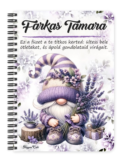 Névvel & Idézettel Kérhető - Kedves Levendulás manó mintás Füzet | Egyedi Ajándék Kávéimádóknak & Személyre Szabható Manós Füzet | nagyoncuki.hu Képzeld el, ahogy egy hosszú nap után leülsz egy csendes sarokba, a levegőben finom levendulaillat száll, a kezedben pedig ez a gyönyörű, személyre szabott füzet pihen, ami csak arra vár, hogy megtöltsd a legszebb gondolataiddal, álmaiddal vagy a hálanaplód bejegyzéseivel. Ez a levendulás manó mintás füzet több, mint egy jegyzetfüzet – egy apró sziget a béke és a nyugalom tengerén, a kreatív elmélyülés hűséges társa. Ez a lila süveges, levendulacsokrot ölelő kis manó a harmónia, a stresszmentes pillanatok és a kreatív ábrándozás szimbóluma. Tökéletes választás, ha szeretnéd lelassítani a rohanó hétköznapokat és egy kis énidőt szentelnél magadnak. Ideális naplóíráshoz, versekhez, pozitív megerősítésekhez vagy a napi gondolatok rendezéséhez. A dizájn finom és lélekemelő, így kiváló ajándék ötlet azoknak, akik értékelik a természet szépségét és a szívhez szóló, személyes meglepetéseket. Ezt a bájos füzetet mi magunk, a nagyoncuki.hu csapata terveztük, így biztos lehetsz benne, hogy egy igazán különleges, magyar dizájnnal készült darabbal leped meg szeretteidet vagy magadat! :)