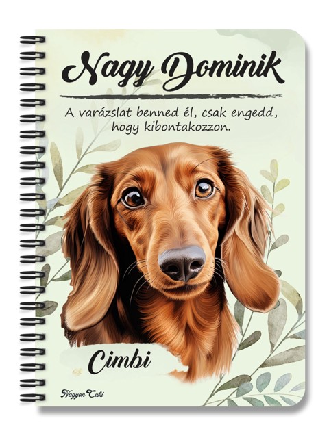 Névvel & Idézettel Kérhető - Barna tacskó portré kutyás Füzet | Egyedi Ajándék Kutyásoknak & Személyre Szabható Kutyás Ajándék | nagyoncuki.hu Minden gazdi tudja, hogy a saját kutyusa a legszebb, legokosabb és legszerethetőbb a világon. Mostantól ezt a büszkeséget és szeretetet magaddal viheted mindenhová ezzel a stílusos, személyre szabható füzettel, amit kedvenc négylábúd portréja díszít. Ez a füzet nemcsak egy egyszerű jegyzetfüzet, hanem egy igazi tisztelgés a gazdi és kutyája közötti különleges kötelék előtt. A portré hűen és szeretettel ragadja meg a tacskó fajta jellegzetes báját és karakterét. Tökéletes választás, ha szeretnéd a legfontosabb jegyzeteidet, terveidet vagy a kutyás kalandjaitok emlékeit egy olyan füzetbe írni, ami igazán közel áll a szívedhez. Legyen szó a kutyaovi emlékeiről, a tréning jegyzeteiről vagy a napi teendőkről, ez a kutyaportrés füzet garantáltan a kedvenced lesz.