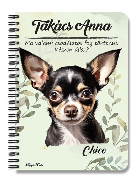 Névvel & Idézettel Kérhető - Fekete Csivava portré kutyás Füzet | Egyedi Ajándék Kutyásoknak & Személyre Szabható Kutyás Ajándék | nagyoncuki.h Minden gazdi tudja, hogy a saját kutyusa a legszebb, legokosabb és legszerethetőbb a világon. Mostantól ezt a büszkeséget és szeretetet magaddal viheted mindenhová ezzel a stílusos, személyre szabható füzettel, amit kedvenc négylábúd portréja díszít. Ez a füzet nemcsak egy egyszerű jegyzetfüzet, hanem egy igazi tisztelgés a gazdi és kutyája közötti különleges kötelék előtt. A portré hűen és szeretettel ragadja meg a Fekete Csivava fajta jellegzetes báját és karakterét. Tökéletes választás, ha szeretnéd a legfontosabb jegyzeteidet, terveidet vagy a kutyás kalandjaitok emlékeit egy olyan füzetbe írni, ami igazán közel áll a szívedhez. Legyen szó a kutyaovi emlékeiről, a tréning jegyzeteiről vagy a napi teendőkről, ez a kutyaportrés füzet garantáltan a kedvenced lesz.
