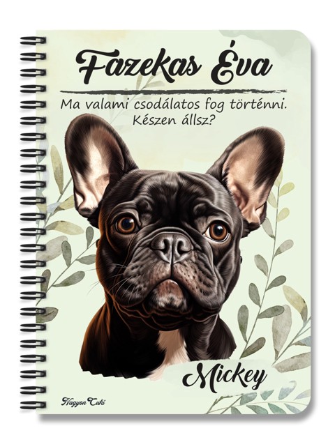 Névvel & Idézettel Kérhető - Fekete francia bulldog portré kutyás Füzet | Egyedi Ajándék Kutyásoknak & Személyre Szabható Kutyás Ajándék | nagyoncuki.h Minden gazdi tudja, hogy a saját kutyusa a legszebb, legokosabb és legszerethetőbb a világon. Mostantól ezt a büszkeséget és szeretetet magaddal viheted mindenhová ezzel a stílusos, személyre szabható füzettel, amit kedvenc négylábúd portréja díszít. Ez a füzet nemcsak egy egyszerű jegyzetfüzet, hanem egy igazi tisztelgés a gazdi és kutyája közötti különleges kötelék előtt. A portré hűen és szeretettel ragadja meg a Fekete francia bulldog fajta jellegzetes báját és karakterét. Tökéletes választás, ha szeretnéd a legfontosabb jegyzeteidet, terveidet vagy a kutyás kalandjaitok emlékeit egy olyan füzetbe írni, ami igazán közel áll a szívedhez. Legyen szó a kutyaovi emlékeiről, a tréning jegyzeteiről vagy a napi teendőkről, ez a kutyaportrés füzet garantáltan a kedvenced lesz.