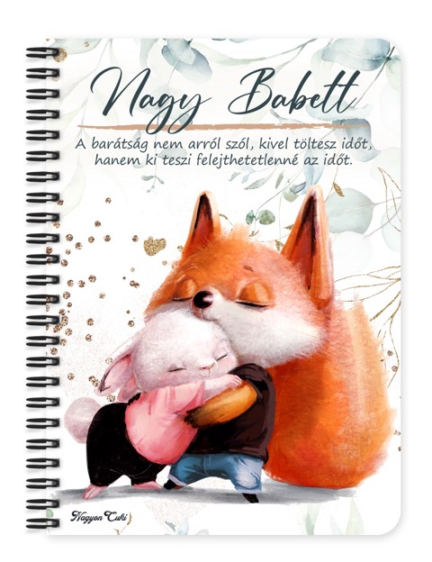 Névvel & Idézettel Kérhető barátság füzet nyuszival és rókával mintás Füzet | Egyedi Ajándék Legjobb a Barátnak | nagyoncuki.hu Képzeld el azt a meghatott pillanatot, amikor átadod ezt a füzetet a legjobb barátodnak. A borítón egy nyuszi és egy róka ölelése szimbolizálja a ti különleges, minden különbséget áthidaló, igaz barátságotokat. Ez a személyre szabott füzet nemcsak egy egyszerű jegyzetfüzet, hanem a ti közös történetetek, a megannyi nevetés és a felejthetetlen emlék kézzelfogható őrzője. Az idézet – "A barátság nem arról szól, kivel töltesz időt, hanem ki teszi felejthetetlenné az időt." – tökéletesen kifejezi, hogy a közös emlékek a legdrágább kincsek. Ez a füzet tökéletes hely, hogy összegyűjtsétek a legviccesebb közös emlékeiteket, a jövőbeli terveiteket, a közös bakancslistátokat, vagy hogy egy-egy kedves üzenettel lepjétek meg egymást. A dizájn finom és szívmelengető, így kiváló ajándék ötlet a legjobb barátodnak, hogy megmutasd neki, mennyire fontos a számodra. A "Cukiságok" kollekció ezen darabját is mi magunk, a nagyoncuki.hu csapata terveztük, így biztos lehetsz benne, hogy egy igazán egyedi, magyar dizájnnal készült ajándékkal leped meg magadat vagy szeretteidet! :) Miért válaszd ezt az barátságos rókás füzetet? Teljesen Személyre Szabható: Tedd igazán a tiétekké! A borítóra nemcsak a neveiteket kérheted, de a gyönyörű alap idézetet is lecserélhetitek egy számotokra fontos saját gondolatra, dátumra vagy egy közös dalotok sorára. Szívmelengető Dizájn: A nyuszi és a róka valószínűtlen barátsága a feltétel nélküli szeretet és elfogadás gyönyörű szimbóluma. Praktikus és Minőségi: A füzet két méretben (A5 és A6) elérhető. A strapabíró spirálkötés és a 60 minőségi, vonalas lap (120 oldal) gondoskodik a kényelmes használatról. Extra Meglepetés: Minden füzethez egy ajándék post-it szett is jár, hogy a legfontosabb gondolatok mindig szem előtt lehessenek. Tökéletes Ajándék a Barátság Ünneplésére: Ideális ajándék születésnapra, névnapra, vagy csak úgy, hogy köszönetet mondj a barátságáért. Kinek ideális ajándék ez a cuki róka és nyuszi mintás füzet? Legjobb barátoknak (BFF-eknek): Akiknek a kapcsolata különleges és mély. Testvéreknek: Akik egyben a legjobb barátok is. Távol élő barátoknak: Hogy egy kézzelfogható tárgy is emlékeztesse őket a szoros kötelékre. Bárkinek, akinek szeretnéd megköszönni a barátságát egy igazán személyes és maradandó ajándékkal. Termékjellemzők: Méretek: Választható A5 (kb. 13,5 cm x 21 cm) vagy A6 (kb. 10,5 cm x 14,5 cm) Borító: Személyre szabható nevekkel és/vagy egyedi idézettel, matt felülettel Belső: Kb. 60 csíkos lap (120 oldal), tetején "memo" és "Subject" segédlettel Kötés: Praktikus és tartós fekete fémspirál Extra: Ajándék post-it szett a füzet elején Egyedi felirattal is kérhető: Ne felejtsd el megadni a kért neveket és/vagy az egyedi idézetet. Rendeld meg most ezt a teljesen személyre szabható, megható füzetet, és ünnepeljétek meg a barátságotokat.
