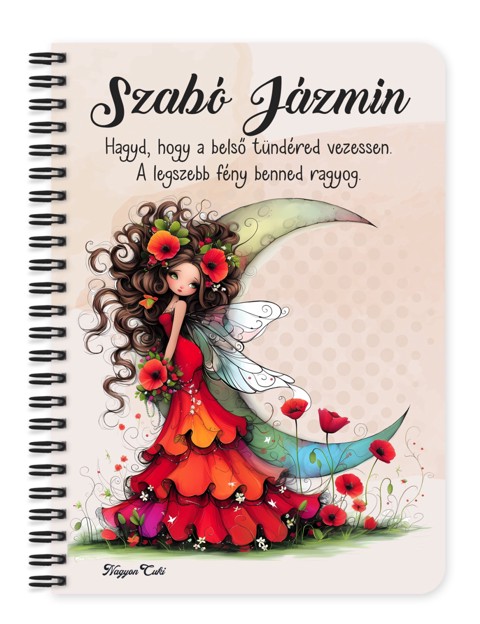 Névvel & Idézettel Kérhető Gyönyörű pipacs tündérlány és a hold Mintás Füzet | A legjobb Ajándék Álmodozóknak | nagyoncuki.hu Képzeld el, ahogy egy csendes estén a holdfény beszűrődik az ablakon, te pedig kinyitod ezt a varázslatos füzetet, hogy leírd a legféltettebb álmaidat és gondolataidat. A borítóján egy tündérlány üldögél a hold sarlóján, pipacsokat tartva a kezében, szimbolizálva az álmok, a belső béke és a fantázia végtelen világát. Ez a tündéres füzet 'a furik' kollekció része, ahol a tökéletlenség a legfőbb báj, és a különcség tesz minket igazán szerethetővé. A pipacsos tündér nem egy harsány hercegnő, hanem egy csendes, álmodozó lélek, aki a saját holdján ülve szemléli a világot. Ő a te belső, kreatív éned tükörképe, aki arra bátorít, hogy merj a fantáziádra hallgatni és a saját utadat járni. AEzt a bájosan zilált tündért mi magunk, a nagyoncuki.hu csapata terveztük, így biztos lehetsz benne, hogy egy igazán egyedi és különleges, művészi darabbal leped meg magadat vagy egy hozzád hasonló álmodozó lelket! :) Miért válaszd ezt a bájos tündéres füzetet? Teljesen Személyre Szabható: Tedd igazán a tiéddé! A borítóra nemcsak a nevedet kérheted, de egy saját, lélekemelő idézetet, verssort vagy egy fontos gondolatot is elhelyezhetsz rajta. Egyedi, Művészi Dizájn: Ez nem egy tömegtermék. A "furi" stílusú grafika azoknak szól, akik értékelik az eredetiséget és a nem mindennapi szépséget. Praktikus és Minőségi: A füzet két méretben (A5 és A6) elérhető. A strapabíró spirálkötés és a 60 minőségi, vonalas lap (120 oldal) gondoskodik a kényelmes használatról. Extra Meglepetés: Minden füzethez egy ajándék post-it szett is jár, hogy a legfontosabb gondolatok mindig szem előtt lehessenek. Tökéletes Ajándék Álmodozóknak: Ideális ajándék születésnapra, névnapra, vagy csak úgy, meglepetésként egy kreatív, érzékeny léleknek. Kinek ideális ajándék ez a szépséges tündér mintás füzet? Álmodozó lelkeknek: Akik szeretnek elmerülni a gondolataikban és a fantázia világában. Naplóíróknak: Akik egy inspiráló és mesés hangulatú füzetbe szeretnék írni a gondolataikat. A tündérek és a mesék rajongóinak: Akik hisznek a varázslatban. Azoknak, akik szeretik a 'furi' stílust: Ha valami igazán egyedit keresel, ami kilóg a sorból, de a legcukibb módon. Nőknek, lányoknak, akik értékelik a finom, nőies és jelentéssel bíró ajándékokat. Termékjellemzők: Méretek: Választható A5 (kb. 13,5 cm x 21 cm) vagy A6 (kb. 10,5 cm x 14,5 cm) Borító: Személyre szabható nevekkel és/vagy egyedi idézettel, matt felülettel Belső: Kb. 60 csíkos lap (120 oldal), tetején "memo" és "Subject" segédlettel Kötés: Praktikus és tartós fekete fémspirál Extra: Ajándék post-it szett a füzet elején Egyedi felirattal is kérhető: Ne felejtsd el megadni a kért neveket és/vagy az egyedi idézetet. RRendeld meg most ezt a teljesen személyre szabható, varázslatos füzetet, és őrizd meg benne a legfényesebb álmaidat!