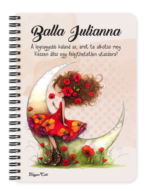 Névvel & Idézettel Kérhető Aranyos pipacs tündérlány és a hold Mintás Füzet | A legjobb Ajándék Álmodozóknak | nagyoncuki.hu Képzeld el, ahogy egy csendes estén a holdfény beszűrődik az ablakon, te pedig kinyitod ezt a varázslatos füzetet, hogy leírd a legféltettebb álmaidat és gondolataidat. A borítóján egy tündérlány üldögél a hold sarlóján, pipacsokat tartva a kezében, szimbolizálva az álmok, a belső béke és a fantázia végtelen világát. Ez a tündéres füzet 'a furik' kollekció része, ahol a tökéletlenség a legfőbb báj, és a különcség tesz minket igazán szerethetővé. A pipacsos tündér nem egy harsány hercegnő, hanem egy csendes, álmodozó lélek, aki a saját holdján ülve szemléli a világot. Ő a te belső, kreatív éned tükörképe, aki arra bátorít, hogy merj a fantáziádra hallgatni és a saját utadat járni. AEzt a bájosan zilált tündért mi magunk, a nagyoncuki.hu csapata terveztük, így biztos lehetsz benne, hogy egy igazán egyedi és különleges, művészi darabbal leped meg magadat vagy egy hozzád hasonló álmodozó lelket! :) Miért válaszd ezt a bájos tündéres füzetet? Teljesen Személyre Szabható: Tedd igazán a tiéddé! A borítóra nemcsak a nevedet kérheted, de egy saját, lélekemelő idézetet, verssort vagy egy fontos gondolatot is elhelyezhetsz rajta. Egyedi, Művészi Dizájn: Ez nem egy tömegtermék. A "furi" stílusú grafika azoknak szól, akik értékelik az eredetiséget és a nem mindennapi szépséget. Praktikus és Minőségi: A füzet két méretben (A5 és A6) elérhető. A strapabíró spirálkötés és a 60 minőségi, vonalas lap (120 oldal) gondoskodik a kényelmes használatról. Extra Meglepetés: Minden füzethez egy ajándék post-it szett is jár, hogy a legfontosabb gondolatok mindig szem előtt lehessenek. Tökéletes Ajándék Álmodozóknak: Ideális ajándék születésnapra, névnapra, vagy csak úgy, meglepetésként egy kreatív, érzékeny léleknek. Kinek ideális ajándék ez a szépséges tündér mintás füzet? Álmodozó lelkeknek: Akik szeretnek elmerülni a gondolataikban és a fantázia világában. Naplóíróknak: Akik egy inspiráló és mesés hangulatú füzetbe szeretnék írni a gondolataikat. A tündérek és a mesék rajongóinak: Akik hisznek a varázslatban. Azoknak, akik szeretik a 'furi' stílust: Ha valami igazán egyedit keresel, ami kilóg a sorból, de a legcukibb módon. Nőknek, lányoknak, akik értékelik a finom, nőies és jelentéssel bíró ajándékokat. Termékjellemzők: Méretek: Választható A5 (kb. 13,5 cm x 21 cm) vagy A6 (kb. 10,5 cm x 14,5 cm) Borító: Személyre szabható nevekkel és/vagy egyedi idézettel, matt felülettel Belső: Kb. 60 csíkos lap (120 oldal), tetején "memo" és "Subject" segédlettel Kötés: Praktikus és tartós fekete fémspirál Extra: Ajándék post-it szett a füzet elején Egyedi felirattal is kérhető: Ne felejtsd el megadni a kért neveket és/vagy az egyedi idézetet. RRendeld meg most ezt a teljesen személyre szabható, varázslatos füzetet, és őrizd meg benne a legfényesebb álmaidat!