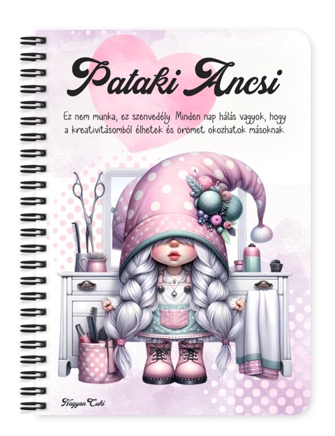 Névvel & Idézettel Kérhető Fodrász manólány az asztalnál mintás Füzet | Egyedi Ajándék Fodrásznak | nagyoncuki.hu Képzeld el, ahogy átadod ezt a cuki füzetet a kedvenc fodrászodnak, akinek a kezei között mindig újjászületsz! Ez a személyre szabott füzet több mint egy jegyzetfüzet: egy kedves "köszönöm" a kreativitásáért, a türelméért és a sok jó beszélgetésért, amit a székében ülve megosztotok egymással. Ez a kis ollóval és fésűvel felszerelkezett manólány a stílus, a szépség és az alkotás iránti szenvedély szimbóluma. Tökéletes választás egy fodrász számára, hogy feljegyezze benne a vendégei időpontjait, inspirációkat gyűjtsön új frizurákhoz, vagy vezesse a saját üzleti teendőit. A dizájn vidám és elismerő, így kiváló ajándék ötlet, amivel kifejezheted a háládat. A "Cuki manók" kollekció ezen darabját is mi magunk, a nagyoncuki.hu csapata terveztük, így biztos lehetsz benne, hogy egy igazán egyedi, magyar dizájnnal készült ajándékkal leped meg a kedvenc szakemberedet. :)