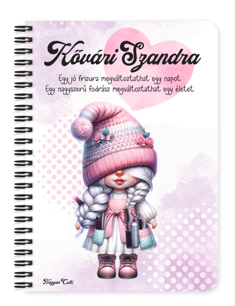 Névvel & Idézettel Kérhető Cuki két oldalas Fodrász manólány mintás Füzet | Egyedi Ajándék Fodrásznak | nagyoncuki.hu Képzeld el, ahogy átadod ezt a cuki füzetet a kedvenc fodrászodnak, akinek a kezei között mindig újjászületsz! Ez a személyre szabott füzet több mint egy jegyzetfüzet: egy kedves "köszönöm" a kreativitásáért, a türelméért és a sok jó beszélgetésért, amit a székében ülve megosztotok egymással. Ez a kis ollóval és fésűvel felszerelkezett manólány a stílus, a szépség és az alkotás iránti szenvedély szimbóluma. Tökéletes választás egy fodrász számára, hogy feljegyezze benne a vendégei időpontjait, inspirációkat gyűjtsön új frizurákhoz, vagy vezesse a saját üzleti teendőit. A dizájn vidám és elismerő, így kiváló ajándék ötlet, amivel kifejezheted a háládat. A "Cuki manók" kollekció ezen darabját is mi magunk, a nagyoncuki.hu csapata terveztük, így biztos lehetsz benne, hogy egy igazán egyedi, magyar dizájnnal készült ajándékkal leped meg a kedvenc szakemberedet. :)
