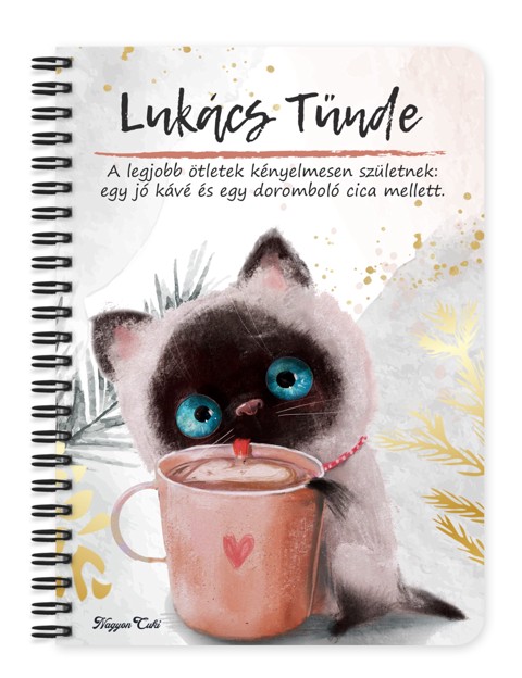 Névvel & Idézettel Kérhető Kávézós Cica Füzet | Egyedi Ajándék Macska és Kávé Rajongóknak | nagyoncuki.hu Képzeld el a csendes reggelt, ahogy az első kávéd melegét élvezed. Melletted, az asztalon ez a kis cirmos pajtás is pont ezt teszi, és bölcsen bólogat: igen, a dorombolás és a nagy tervek ideje csak a koffein után jön el. Ez a személyre szabott füzet a tökéletes tisztelgés a kávé és a macskák szent szövetsége előtt. Ez a bögrét ölelő cica a nyugodt reggelek, a megfontolt napindítás és a "csak még öt perc" pillanatok aranyos szimbóluma. Ő minden cicagazdi és kávérajongó lelki társa, aki pontosan tudja, hogy a világ meghódítása előtt elengedhetetlen egy jó adag kávé. Tökéletes választás a napi teendők, a nagy ötletek, vagy akár a cica vicces szokásainak feljegyzésére. A "Cukiságok" kollekció ezen darabját is mi magunk, a nagyoncuki.hu csapata terveztük, így biztos lehetsz benne, hogy egy igazán egyedi, magyar dizájnnal készült ajándékkal leped meg magadat vagy egy másik macskaimádót! :) Miért válaszd ezt a személyre szabható a tündéri cica mintás füzetet? Teljesen Személyre Szabható: Tedd 100%-ban egyedivé! A borítóra nemcsak a nevedet kérheted, de a mintán szereplő alap idézetet is lecserélheted a saját, kedvenc motivációs üzenetedre vagy egy személyes gondolatra. Imádnivaló Dizájn: A kávéfüggő cica figurája minden gazdi számára ismerős érzéseket közvetít, garantáltan mosolyt csalva az arcokra. Praktikus és Minőségi: A füzet két méretben (A5 és A6) elérhető. A strapabíró spirálkötés és a 60 minőségi, vonalas lap (120 oldal) gondoskodik a kényelmes használatról. Extra Meglepetés: Minden füzethez egy ajándék post-it szett is jár, hogy a legfontosabb gondolatok mindig szem előtt lehessenek. Tökéletes Ajándék Álmodozóknak: Ideális ajándék születésnapra, névnapra, vagy csak úgy, meglepetésként valakinek, aki hisz a varázslatban és a kávé erejében! Kinek ideális ajándék ez a cuki cica mintás füzet? Minden macskamániásnak: Akiknek az élete a cicák körül forog. Kávéimádóknak, akik "nem reggeli emberek": Akiknek ez a cica a hivatalos kabalaállatuk. Gazdiknak: Akik büszkén viselnék a cicájuk nevét egy ilyen cuki füzeten. Kollégáknak, barátoknak: Akiknek szeretnél egy vicces és személyes ajándékot adni, ami feldobja a munkanapokat. Bárkinek, aki értékeli a cuki állatokat és egy különleges ajándékot keres. Termékjellemzők: Méretek: Választható A5 (kb. 13,5 cm x 21 cm) vagy A6 (kb. 10,5 cm x 14,5 cm) Borító: Személyre szabható névvel és/vagy egyedi idézettel, matt felülettel Belső: Kb. 60 csíkos lap (120 oldal), tetején "memo" és "Subject" segédlettel Kötés: Praktikus és tartós fekete fémspirál Extra: Ajándék post-it szett a füzet elején Egyedi felirattal is kérhető: Ne felejtsd el megadni a kért nevet és/vagy az egyedi idézetet a megjegyzés rovatban rendeléskor! Rendeld meg most ezt a teljesen személyre szabható, egyedi cicafüzetet, és indítsd a napot egy dorombolásnyi jókedvvel...mert mindenkinek jár egy kis cukiság. Ha elvarázsolt ez a tündéri dizájn, és tetszenek a személyre szabható ajándék ötleteink, nézd meg a többi aranyos figurát is a Cukiságok kollekció a nagyoncuki.hu-n! Fedezz fel még több egyedi ajándékot állatbarátoknak és más, vidám témájú csodát!