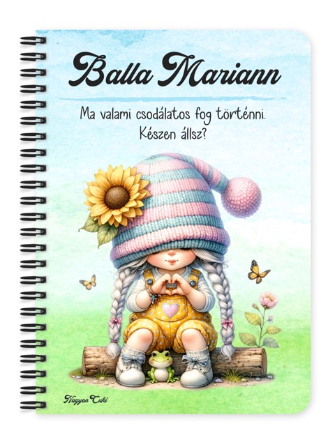 Névvel & Idézettel Kérhető Szívecskés napraforgós manó lány mintás Füzet | Legjobb ajándék Nőknek | nagyoncuki.hu Képzeld el, ahogy kinyitod ezt a füzetet, és szinte érzed a nyári nap melegét és a napraforgók illatát! A borítóján egy kedves kis manó ölel át egy hatalmas napraforgót, szimbolizálva a feltétel nélküli optimizmust, a pozitivitást és a természet éltető erejét. Ez a személyre szabott füzet egy hordozható adag napsütés a borúsabb napokra is. Ez a vidám manó a boldogság, a belső erő és a fény felé fordulás apró, de annál erősebb szimbóluma. Arra emlékeztet minket, hogy még a legnehezebb időkben is keressük a fényt és a jót az életünkben. Tökéletes választás hálanapló vezetéséhez, pozitív megerősítések leírásához, vagy a legvidámabb gondolatok és tervek összegyűjtésére. A "Cuki manók" kollekció ezen darabját is mi magunk, a nagyoncuki.hu csapata terveztük, így biztos lehetsz benne, hogy egy igazán egyedi, magyar dizájnnal készült ajándékkal leped meg magadat vagy egy számodra fontos, napsugaras lelkű személyt. :)