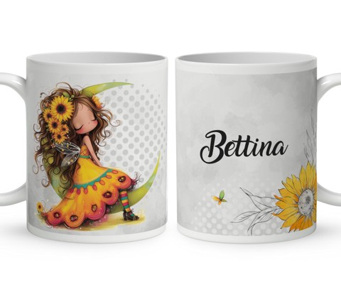 Indítsd a napot egy adag napsugaras bájjal ezzel a névre szóló, cuki napraforgós tündérlányos bögrével.