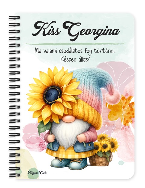 Névvel & Idézettel Kérhető Cuki napraforgós manó egy szál virággal mintás Füzet | Legjobb ajándék Nőknek | nagyoncuki.hu Képzeld el, ahogy kinyitod ezt a füzetet, és szinte érzed a nyári nap melegét és a napraforgók illatát! A borítóján egy kedves kis manó ölel át egy hatalmas napraforgót, szimbolizálva a feltétel nélküli optimizmust, a pozitivitást és a természet éltető erejét. Ez a személyre szabott füzet egy hordozható adag napsütés a borúsabb napokra is. Ez a vidám manó a boldogság, a belső erő és a fény felé fordulás apró, de annál erősebb szimbóluma. Arra emlékeztet minket, hogy még a legnehezebb időkben is keressük a fényt és a jót az életünkben. Tökéletes választás hálanapló vezetéséhez, pozitív megerősítések leírásához, vagy a legvidámabb gondolatok és tervek összegyűjtésére. A "Cuki manók" kollekció ezen darabját is mi magunk, a nagyoncuki.hu csapata terveztük, így biztos lehetsz benne, hogy egy igazán egyedi, magyar dizájnnal készült ajándékkal leped meg magadat vagy egy számodra fontos, napsugaras lelkű személyt. :)