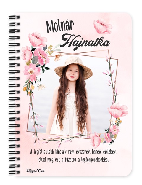 Saját fotóval, névvel és szöveggel kérhető bájos virág mintás füzet | Egyedi Fényképes Ajándék Bármilyen Alkalomra | nagyoncuki.h Vannak pillanatok, amiket örökre a szívünkbe zárunk. Egy nevetés, egy ölelés, egy közös kaland. Mi lenne, ha ezt a pillanatot nemcsak a szívedben, de egy gyönyörű, személyes tárgyon is őrizhetnéd? Ez a saját fotóval készülő füzet pontosan erre született: hogy a legdrágább emlékedet egy kézzelfogható, szeretettel teli kinccsé változtassa. A füzet borítóját egy finom, pasztell rózsaszín, virágos dizájn díszíti, amely egy gyönyörű keretet alkot a te legkedvesebb fotód számára. Nem kell grafikusnak lenned: te adod az emléket, mi pedig a varázslatos körítést, hogy a végeredmény egy igazán profi és megható ajándék legyen.