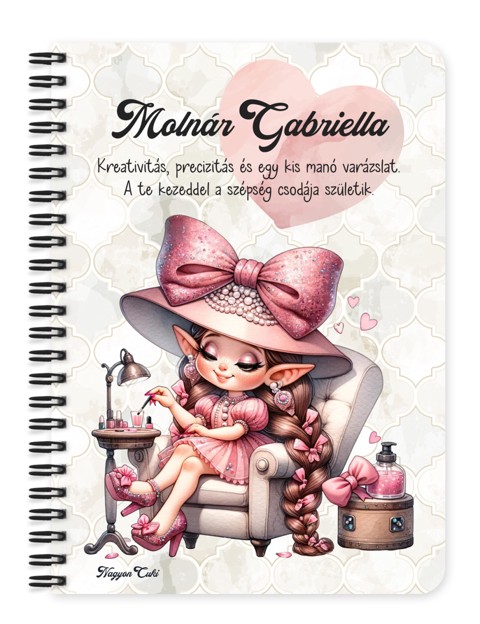 Névvel & Idézettel Kérhető Szépséges Körmös manólány mintás Füzet | Legjobb ajándék Műkörmösöknek | nagyoncuki.hu Képzeld el, ahogy átadod ezt a cuki füzetet a kedvenc műkörmösödnek, aki apró, precíz mozdulatokkal alkot műremekeket a körmeidre! Ez a személyre szabott füzet több mint egy jegyzetfüzet: egy csillogó "köszönöm" a kreativitásáért, a türelméért és a sok jó beszélgetésért, ami feldobja a manikűrözéssel töltött időt. Ez a kis ecsettel és körömlakkal felszerelkezett manó a precizitás, a csillogás és a miniatűr műalkotások iránti szenvedély szimbóluma. Arra inspirál, hogy a legjobb ötleteket, a vendégek időpontjait vagy a legújabb trendeket egy olyan helyen gyűjtse össze, ami méltó ehhez a szép szakmához. Tökéletes választás vendég-naptárnak, a dizájnok lerajzolásához vagy üzleti teendők vezetéséhez. A "Cuki manók" kollekció ezen darabját is mi magunk, a nagyoncuki.hu csapata terveztük, így biztos lehetsz benne, hogy egy igazán egyedi, magyar dizájnnal készült ajándékkal leped meg magadat vagy egy számodra fontos, napsugaras lelkű személyt. :)
