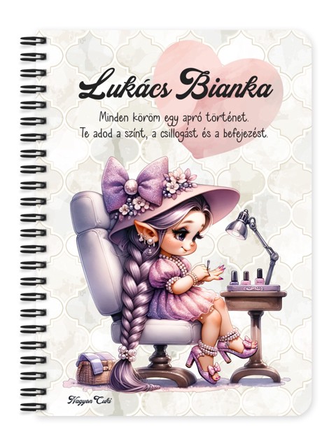 Névvel & Idézettel Kérhető Cuki lila Körmös manólány mintás Füzet | Legjobb ajándék Műkörmösöknek | nagyoncuki.hu Képzeld el, ahogy átadod ezt a cuki füzetet a kedvenc műkörmösödnek, aki apró, precíz mozdulatokkal alkot műremekeket a körmeidre! Ez a személyre szabott füzet több mint egy jegyzetfüzet: egy csillogó "köszönöm" a kreativitásáért, a türelméért és a sok jó beszélgetésért, ami feldobja a manikűrözéssel töltött időt. Ez a kis ecsettel és körömlakkal felszerelkezett manó a precizitás, a csillogás és a miniatűr műalkotások iránti szenvedély szimbóluma. Arra inspirál, hogy a legjobb ötleteket, a vendégek időpontjait vagy a legújabb trendeket egy olyan helyen gyűjtse össze, ami méltó ehhez a szép szakmához. Tökéletes választás vendég-naptárnak, a dizájnok lerajzolásához vagy üzleti teendők vezetéséhez. A "Cuki manók" kollekció ezen darabját is mi magunk, a nagyoncuki.hu csapata terveztük, így biztos lehetsz benne, hogy egy igazán egyedi, magyar dizájnnal készült ajándékkal leped meg magadat vagy egy számodra fontos, napsugaras lelkű személyt. :)