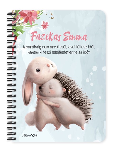 Névvel & Idézettel Kérhető Nyuszi és Süni mintás Füzet | Egyedi Ajándék Nőknek & Személyes napló barátoknak| nagyoncuki.hu Képzeld el azt a meghatott pillanatot, amikor átadod ezt a füzetet a legjobb barátodnak. A borítóján egy süni és egy nyuszi gyengéd ölelése szimbolizálja a ti különleges kapcsolatotokat: azt, hogy a valódi szeretet elfogadó, gondoskodó, és a legnagyobb különbségeket is áthidalja. Ez a jelenet a feltétel nélküli barátságról mesél. Arról, hogyan lehet óvatosan és szeretettel közeledni egymáshoz, és hogy a legpuhább szív a legvédettebb külső alatt is ott doboghat. Ez a füzet tökéletes hely a közös emlékek, a mély beszélgetések és a jövőbeli tervek feljegyzésére, egy olyan hely, ami a ti egyedi köteléketeket ünnepli. A "Cukiságok" kollekció ezen darabját is mi magunk, a nagyoncuki.hu csapata terveztük, így biztos lehetsz benne, hogy egy igazán egyedi, magyar dizájnnal készült ajándékkal leped meg magadat vagy egy szeretteidet! :) Miért válaszd ezt a személyre szabható barátság füzetet? Teljesen Személyre Szabható: Tedd 100%-ban egyedivé! A borítóra nemcsak a nevedet kérheted, de a mintán szereplő alap idézetet is lecserélheted a saját, inspiráló mottódra vagy egy kedves üzenetre. Szívmelengető Dizájn: A süni és a nyuszi barátsága az elfogadás és a gyengédség gyönyörű szimbóluma, ami mindenki szívét megérinti. Praktikus és Minőségi: A füzet két méretben (A5 és A6) elérhető. A strapabíró spirálkötés és a 60 minőségi, vonalas lap (120 oldal) gondoskodik a kényelmes használatról. Extra Meglepetés: Minden füzethez egy ajándék post-it szett is jár, hogy a legfontosabb gondolatok mindig szem előtt lehessenek. Tökéletes Ajándék a Barátság Ünneplésére: Ideális ajándék születésnapra, névnapra, vagy csak úgy, hogy megköszönd a barátodnak a feltétel nélküli támogatását. Kinek ideális ajándék ez a süni és nyuszi mintás füzet? Legjobb barátoknak, akik teljesen különbözőek, mégis tökéletesen kiegészítik egymást. Testvéreknek, hogy megünnepeljék a különleges köteléküket. Bárkinek, akinek szeretnéd megköszönni a türelmét és a feltétel nélküli barátságát. Az erdei állatok és a kedves, jelentéssel bíró történetek szerelmeseinek. Termékjellemzők: Méretek: Választható A5 (kb. 13,5 cm x 21 cm) vagy A6 (kb. 10,5 cm x 14,5 cm) Borító: Személyre szabható névvel és/vagy egyedi idézettel, matt felülettel Belső: Kb. 60 csíkos lap (120 oldal), tetején "memo" és "Subject" segédlettel Kötés: Praktikus és tartós fekete fémspirál Extra: Ajándék post-it szett a füzet elején Egyedi felirattal is kérhető: Ne felejtsd el megadni a kért nevet és/vagy az egyedi idézetet a megjegyzés rovatban rendeléskor! Rendeld meg most ezt a teljesen személyre szabható, megható füzetet, és ünnepeljétek meg a barátságotokat, ami minden tüskénél erősebb...mert mindenkinek jár egy kis cukiság. Ha elvarázsolt ez a kedves dizájn, és tetszenek a személyre szabható ajándék ötleteink, nézd meg a többi aranyos figurát is a Cukiságok kollekció a nagyoncuki.hu-n! Fedezz fel még több egyedi ajándékot és más, vidám témájú csodát!