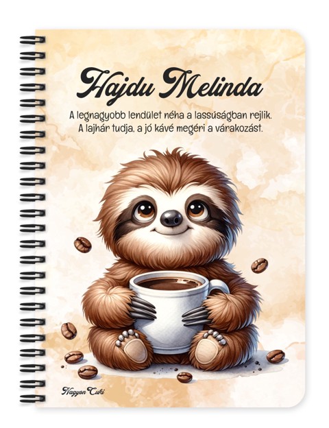 Névvel & Idézettel Kérhető Lazulós Kávés lajhár mintás Füzet | Legjobb ajándék Nőknek & Személyes napló| nagyoncuki.hu Képzeld el a reggelt, amikor semmi sem sürget. Lassan kinyitod a szemed, és az első dolgod egy forró kávé. Ez a füzet, aminek borítójáról egy kedves, bögrét ölelő lajhár mosolyog rád, a ráérős, nyugodt napindítás tökéletes szimbóluma. Ő a bizonyíték, hogy a leglassabb teremtményeknek is jár egy kis koffein-löket a napkezdéshez. Ez a kávéimádó lajhár a "slow living", a tudatos lelassulás és a "majd ráérek" pillanatok aranyos nagykövete. Azt üzeni, hogy nem kell rohanni sehova, de egy jó kávé még a lassú mozgáshoz is ad egy kis extra, kellemes löketet. Tökéletes társ a gondolatok lassú, megfontolt lejegyzéséhez, a naplóíráshoz vagy a teendők ráérős megtervezéséhez. A "Cuki manók" kollekció ezen darabját is mi magunk, a nagyoncuki.hu csapata terveztük, így biztos lehetsz benne, hogy egy igazán egyedi, magyar dizájnnal készült ajándékkal leped meg magadat vagy egy egy másik lajhár-rajongót. :) Miért válaszd ezt az aranyos lajháros manós füzetet? Teljesen Személyre Szabható: Tedd 100%-ban egyedivé! A borítóra nemcsak a nevedet kérheted, de a mintán szereplő alap idézetet is lecserélheted a saját, kedvenc motivációs üzenetedre vagy egy személyes gondolatra. Humoros és Imádnivaló Dizájn: A világ leglassabb állatának és a kávénak a párosa egy vicces és szerethető kombináció, ami garantáltan jókedvre derít. Praktikus és Minőségi: A füzet két méretben (A5 és A6) elérhető, így kiválaszthatod a neked legmegfelelőbbet. A strapabíró spirálkötés és a 60 minőségi, vonalas lap (120 oldal) gondoskodik a kényelmes használatról. Extra Meglepetés: Minden füzethez egy ajándék post-it szett is jár, hogy a legfontosabb jegyzetek mindig kéznél legyenek. Tökéletes Ajándék a Nyugalomért: Ideális ajándék születésnapra, névnapra, vagy csak úgy, hogy emlékeztess valakit a pihenés fontosságára. Kinek ideális ajándék ez a cuki kávézós lajhár mintás füzet? Minden lajhár-rajongónak, aki imádja ezeket a békés, mosolygós állatokat. Akik a "slow living" életmódot követik, és értékelik a lassú, tudatos pillanatokat. Akik bevallottan "nem reggeli emberek", és a lajhár a hivatalos kabalaállatuk. Bárkinek, aki értékeli a cuki és humoros ajándékokat. Termékjellemzők: Méretek: Választható A5 (kb. 13,5 cm x 21 cm) vagy A6 (kb. 10,5 cm x 14,5 cm) Borító: Személyre szabható névvel és/vagy egyedi idézettel, matt felülettel Belső: Kb. 60 csíkos lap (120 oldal), tetején "memo" és "Subject" segédlettel Kötés: Praktikus és tartós fekete fémspirál Extra: Ajándék post-it szett a füzet elején Egyedi felirattal is kérhető: Ne felejtsd el megadni a kért nevet és/vagy az egyedi idézetet. Rendeld meg most ezt a teljesen személyre szabható, egyedi lajháros füzetet, és élvezd a napot ráérősen... mert mindenkinek jár egy kis cukiság! Ha Ha elvarázsolt a cuki lajhárok világa, és tetszenek a személyre szabható ajándék ötleteink, nézd meg a többi aranyos lajháros dizájnnal készült termékünket is a "Cuki Lajhárok" Kollekcióban a nagyoncuki.hu-n!