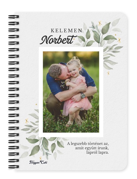 Saját Fotós Személyre Szabható Füzet - Gyönyörű Levelek | Egyedi Fényképes Ajándék Bármilyen Alkalomra | nagyoncuki.hu Vannak pillanatok, amiket örökre a szívünkbe zárunk. Egy nevetés, egy ölelés, egy közös kaland. Mi lenne, ha ezt a pillanatot nemcsak a szívedben, de egy gyönyörű, személyes tárgyon is őrizhetnéd? Ez a saját fotóval készülő füzet pontosan erre született: hogy a legdrágább emlékedet egy kézzelfogható, szeretettel teli kinccsé változtassa. A füzet borítóját egy finom, pasztell, leveles dizájn díszíti, amely egy gyönyörű keretet alkot a te legkedvesebb fotód számára. Nem kell grafikusnak lenned: te adod az emléket, mi pedig a varázslatos körítést, hogy a végeredmény egy igazán profi és megható ajándék legyen.