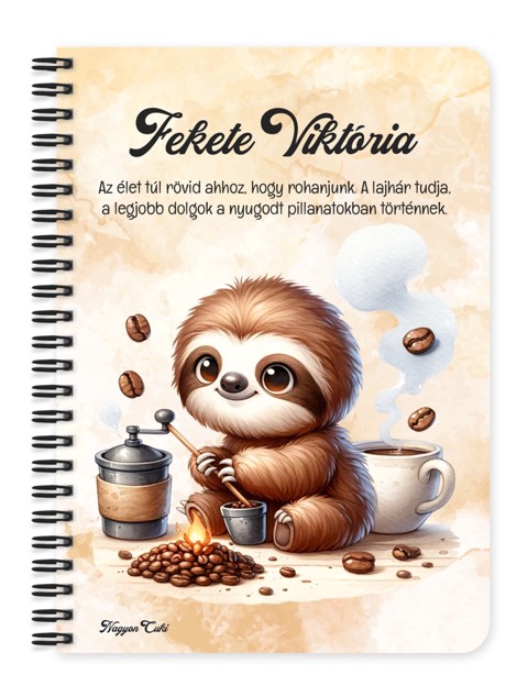 Névvel & Idézettel Kérhető Kávés lajhár és frissen pörkölt kávé mintás Füzet | Legjobb ajándék Nőknek & Személyes napló| nagyoncuki.hu Képzeld el a reggelt, amikor semmi sem sürget. Lassan kinyitod a szemed, és az első dolgod egy forró kávé. Ez a füzet, aminek borítójáról egy kedves, bögrét ölelő lajhár mosolyog rád, a ráérős, nyugodt napindítás tökéletes szimbóluma. Ő a bizonyíték, hogy a leglassabb teremtményeknek is jár egy kis koffein-löket a napkezdéshez. Ez a kávéimádó lajhár a "slow living", a tudatos lelassulás és a "majd ráérek" pillanatok aranyos nagykövete. Azt üzeni, hogy nem kell rohanni sehova, de egy jó kávé még a lassú mozgáshoz is ad egy kis extra, kellemes löketet. Tökéletes társ a gondolatok lassú, megfontolt lejegyzéséhez, a naplóíráshoz vagy a teendők ráérős megtervezéséhez. A "Cuki manók" kollekció ezen darabját is mi magunk, a nagyoncuki.hu csapata terveztük, így biztos lehetsz benne, hogy egy igazán egyedi, magyar dizájnnal készült ajándékkal leped meg magadat vagy egy egy másik lajhár-rajongót. :) Miért válaszd ezt az aranyos lajháros manós füzetet? Teljesen Személyre Szabható: Tedd 100%-ban egyedivé! A borítóra nemcsak a nevedet kérheted, de a mintán szereplő alap idézetet is lecserélheted a saját, kedvenc motivációs üzenetedre vagy egy személyes gondolatra. Humoros és Imádnivaló Dizájn: A világ leglassabb állatának és a kávénak a párosa egy vicces és szerethető kombináció, ami garantáltan jókedvre derít. Praktikus és Minőségi: A füzet két méretben (A5 és A6) elérhető, így kiválaszthatod a neked legmegfelelőbbet. A strapabíró spirálkötés és a 60 minőségi, vonalas lap (120 oldal) gondoskodik a kényelmes használatról. Extra Meglepetés: Minden füzethez egy ajándék post-it szett is jár, hogy a legfontosabb jegyzetek mindig kéznél legyenek. Tökéletes Ajándék a Nyugalomért: Ideális ajándék születésnapra, névnapra, vagy csak úgy, hogy emlékeztess valakit a pihenés fontosságára. Kinek ideális ajándék ez a cuki kávézós lajhár mintás füzet? Minden lajhár-rajongónak, aki imádja ezeket a békés, mosolygós állatokat. Akik a "slow living" életmódot követik, és értékelik a lassú, tudatos pillanatokat. Akik bevallottan "nem reggeli emberek", és a lajhár a hivatalos kabalaállatuk. Bárkinek, aki értékeli a cuki és humoros ajándékokat. Termékjellemzők: Méretek: Választható A5 (kb. 13,5 cm x 21 cm) vagy A6 (kb. 10,5 cm x 14,5 cm) Borító: Személyre szabható névvel és/vagy egyedi idézettel, matt felülettel Belső: Kb. 60 csíkos lap (120 oldal), tetején "memo" és "Subject" segédlettel Kötés: Praktikus és tartós fekete fémspirál Extra: Ajándék post-it szett a füzet elején Egyedi felirattal is kérhető: Ne felejtsd el megadni a kért nevet és/vagy az egyedi idézetet. Rendeld meg most ezt a teljesen személyre szabható, egyedi lajháros füzetet, és élvezd a napot ráérősen... mert mindenkinek jár egy kis cukiság! Ha Ha elvarázsolt a cuki lajhárok világa, és tetszenek a személyre szabható ajándék ötleteink, nézd meg a többi aranyos lajháros dizájnnal készült termékünket is a "Cuki Lajhárok" Kollekcióban a nagyoncuki.hu-n!
