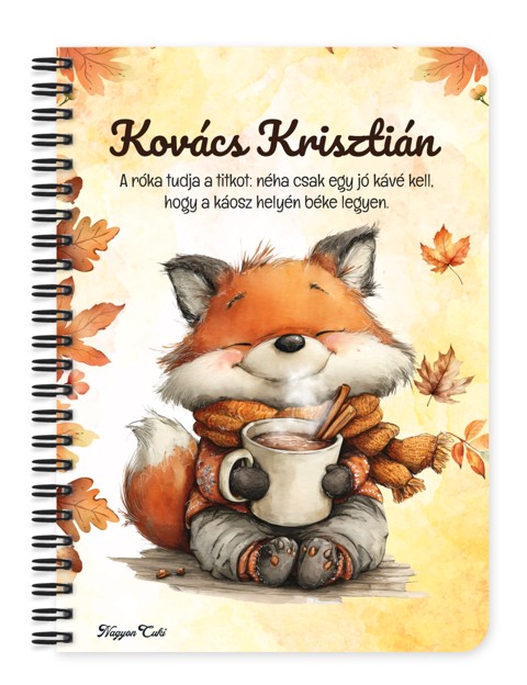 Névvel & Idézettel Kérhető Cuki őszi kávézós róka mintás Füzet | Legjobb ajándék ötlet Rókarajongóknak & Személyes Napló, jegyzetfüzet | nagyoncuki.hu Képzeld el azt a mosolyt és inspirációt, amikor egy olyan füzetet tartasz a kezedben, amely nemcsak a teendőid és jegyzeteid rendszerezésére szolgál, hanem a rókák ravasz báját, az őszi meghittséget és a kávé iránti szeretetet is tükrözi! Ez a különleges, névre szóló, egyedi tervezésű őszi kávézós róka füzet a kényelmes bekuckózás, a kreativitás és az Erdei Varázs kollekció elragadó megtestesítője. Egy apró, szeretetteljes gesztus, amely a tanulást, a munkát és a jegyzetelést is fénnyel tölti meg, inspirációt adva minden sorhoz. Kiváló ajándék ötlet mindenkinek – legyen szó kávéimádóról, diákról, vagy kollégáról – aki értékeli a személyes és lélekemelő meglepetéseket! Ezt a bájos füzetet mi magunk, a nagyoncuki.hu csapata terveztük, így biztos lehetsz benne, hogy egy igazán egyedi, magyar és személyre szabható ajándék darabbal leped meg szeretteidet vagy magadat! Miért válaszd ezt a személyre szabható az őszi róka mintás füzetet? Teljesen Személyre Szabható: Tedd még különlegesebbé az ajándékot a megajándékozott nevével! Egy igazán névre szóló füzet élmény, ami azt üzeni: "Ez csak a tied, élvezd a kávészünetet! Egyedi design: A füzet designja szeretettel készült, kifejezetten a rókák, az őszi kávé és az Erdei Varázs kollekció szerelmesei számára. Igazi rókás ajándék különlegesség. Praktikus és Minőségi: A füzet két méretben (A5 és A6) elérhető. A strapabíró spirálkötés és a 60 minőségi, vonalas lap (120 oldal) gondoskodik a kényelmes használatról. Extra Meglepetés: Minden füzethez egy ajándék post-it szett is jár, hogy a legfontosabb gondolatok mindig szem előtt lehessenek. Tökéletes ajándék mindenkinek: Legyen szó iskolakezdésről, születésnapról, névnapról, vagy karácsonyról, ez a névvel ellátott füzet mindig telitalálat! Kinek ideális ajándék ez a cuki őszi róka mintás füzet? Róka Rajongóknak és a Kávé Kedvelőinek: Mindenkinek, aki a rókákat, az erdei állatokat és a bájos, Erdei Varázs stílus rajongója. A tanulás, tervezés és jegyzetelés kedvelőinek: Akik szeretnék rendszerezni a gondolataikat és teendőiket egy szép füzetben Egyedi és személyes ajándékot keresőknek: Ha valami igazán különlegeset és névre szólót szeretnél adni. Hol használhatod a Cuki őszi róka mintás füzetet: Otthon:Naplóírásra, jegyzetelésre, receptek gyűjtésére, vagy őszi teendők listázására. Irodában/Suliban: Jegyzeteléshez, határidők rögzítéséhez – hogy az ünnepi hangulat a munkába is elkísérjen. Ajándékként: Önmagában is egy csodás meglepetés, de akár egy rókás ajándékcsomag részeként is tökéletes választás. Termékjellemzők: Méretek: Választható A5 (kb. 13,5 cm x 21 cm) vagy A6 (kb. 10,5 cm x 14,5 cm) Borító: Személyre szabható névvel és/vagy egyedi idézettel, matt felülettel Belső: Kb. 60 csíkos lap (120 oldal), tetején "memo" és "Subject" segédlettel Kötés: Praktikus és tartós fekete fémspirál Extra: Ajándék post-it szett a füzet elején Egyedi felirattal is kérhető: Ne felejtsd el megadni a kért nevet és/vagy az egyedi idézetet a megjegyzés rovatban rendeléskor! Lepd meg a szerettedet, barátodat, kollégádat vagy saját magadat ezzel a bájos és személyre szabott füzettel! Rendeld meg most ezt az egyedi, névre szóló rókás füzetet, és vigyél egy kis extra őszi örömet és inspirációt a mindennapokba!...mert mindenkinek jár egy kis cukiság. Ha tetszik neked ez az igazán aranyos dizájn, és tetszenek a személyre szabható ajándék ötleteink, nézd meg az Erdei varázs kollekciónkat is a nagyoncuki.hu-n!