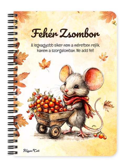 Névvel & Idézettel Kérhető Cuki őszi gyűjtögető kisegér mintás Füzet | Névre Szóló Ajándék & Személyes Jegyzetfüzet | nagyoncuki.hu Képzeld el azt a mosolyt és a békés hangulatot, amikor egy olyan füzetet tartasz a kezedben, amely nemcsak a teendőid és jegyzeteid rendszerezésére szolgál, hanem a kisegér szelíd báját, az őszi meghittséget és a szorgalmas gyűjtögetés örömét is tükrözi! Ez a különleges, névre szóló, egyedi tervezésű őszi kisegér füzet a kényelmes pihenés, a kreativitás és az Erdei Varázs kollekció elragadó megtestesítője. Egy apró, szeretetteljes gesztus, amely a tanulást, a munkát és a jegyzetelést is fénnyel tölti meg, inspirációt adva minden sorhoz. Kiváló ajándék ötlet mindenkinek – legyen szó nőről, férfiról, vagy diákról – aki értékeli a személyes és lélekemelő meglepetéseket! Ezt a bájos füzetet mi magunk, a nagyoncuki.hu csapata terveztük, így biztos lehetsz benne, hogy egy igazán egyedi, magyar és személyre szabható ajándék darabbal leped meg szeretteidet vagy magadat! Miért válaszd ezt a személyre szabható az őszi kisegér mintás füzetet? Teljesen Személyre Szabható: Tedd még különlegesebbé az ajándékot a megajándékozott nevével! Egy igazán névre szóló füzet élmény, ami azt üzeni: "Ez csak a tied, írd a saját történeted! Egyedi design: A füzet designja szeretettel készült, kifejezetten a madarak, az őszi vidámság és az Erdei Varázs kollekció szerelmesei számára. Igazi kisegeres ajándék különlegesség. Praktikus és Minőségi: A füzet két méretben (A5 és A6) elérhető. A strapabíró spirálkötés és a 60 minőségi, vonalas lap (120 oldal) gondoskodik a kényelmes használatról. Extra Meglepetés: Minden füzethez egy ajándék post-it szett is jár, hogy a legfontosabb gondolatok mindig szem előtt lehessenek. Tökéletes ajándék mindenkinek: Legyen szó iskolakezdésről, születésnapról, névnapról, vagy karácsonyról, ez a névvel ellátott füzet mindig telitalálat! Kinek ideális ajándék ez a cuki őszi kisegér mintás füzet? Kisegér Rajongóknak és a Szorgalom Kedvelőinek: Mindenkinek, aki a kisegereket, az erdei állatokat és a bájos, Erdei Varázs stílus rajongója. A tanulás, tervezés és jegyzetelés kedvelőinek: Akik szeretnék rendszerezni a gondolataikat és teendőiket egy szép füzetben Egyedi és személyes ajándékot keresőknek: Ha valami igazán különlegeset és névre szólót szeretnél adni. Hol használhatod a Cuki őszi kisegér mintás füzetet: Otthon:Naplóírásra, jegyzetelésre, receptek gyűjtésére, vagy őszi teendők listázására. Irodában/Suliban: Jegyzeteléshez, határidők rögzítéséhez – hogy az ünnepi hangulat a munkába is elkísérjen. Ajándékként: Önmagában is egy csodás meglepetés, de akár egy egeres ajándékcsomag részeként is tökéletes választás egy macis bögrével kiegészítve. Termékjellemzők: Méretek: Választható A5 (kb. 13,5 cm x 21 cm) vagy A6 (kb. 10,5 cm x 14,5 cm) Borító: Személyre szabható névvel és/vagy egyedi idézettel, matt felülettel Belső: Kb. 60 csíkos lap (120 oldal), tetején "memo" és "Subject" segédlettel Kötés: Praktikus és tartós fekete fémspirál Extra: Ajándék post-it szett a füzet elején Egyedi felirattal is kérhető: Ne felejtsd el megadni a kért nevet és/vagy az egyedi idézetet a megjegyzés rovatban rendeléskor! Lepd meg a szerettedet, barátodat, kollégádat vagy saját magadat ezzel a bájos és személyre szabott füzettel! Rendeld meg most ezt az egyedi, névre szóló kisegér mintás füzetet, és vigyél egy kis extra őszi örömet és inspirációt a mindennapokba!...mert mindenkinek jár egy kis cukiság. Ha tetszik neked ez az igazán aranyos dizájn, és tetszenek a személyre szabható ajándék ötleteink, nézd meg az Erdei varázs kollekciónkat is a nagyoncuki.hu-n!