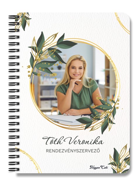 Fényképes - Névvel és Foglalkozással Kérhető Elegáns Füzet (Arany zöld leveles) | Személyre Szabott Ajándék Nőknek & Professzionális Jegyzetfüzet | nagyoncuki.hu Képzeld el azt a magabiztosságot és elismerő pillantásokat, amikor egy olyan füzetet tartasz a kezedben, amelynek borítója a te elegáns fotódat, a nevedet és a foglalkozásodat (pl. Rendezvényszervező, Művész, stb.) hirdeti! Ez a különleges, fényképpel kérhető füzet a professzionalizmus, a stílus és az egyediség tökéletes megtestesítője. A borítón látható arany keretes, zöld leveles dizájn igazi nőies eleganciát kölcsönöz. Egy apró, de annál hatásosabb gesztus, amely a munkát, a jegyzetelést és a találkozókat is fénnyel tölti meg, inspirációt adva minden sorhoz. Kiváló ajándék ötlet nőknek és vállalkozó hölgyeknek, akik értékelik a személyes, de mégis professzionális kiegészítőket. A füzet borítóját gyönyörű arany keret és zöld leveles dizájn díszíti, amely egy gyönyörű keretet alkot a fotód számára. Nem kell grafikusnak lenned: te adod a profi fotót, mi pedig a varázslatos körítést, hogy a végeredmény egy igazán egyedi és megható ajándék legyen.