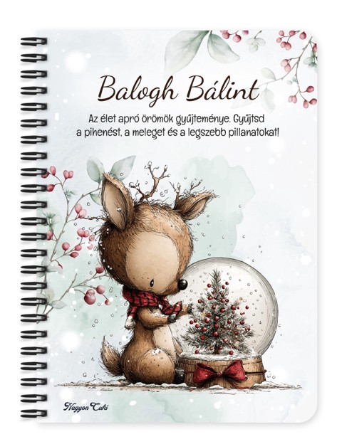 Névvel & Idézettel Kérhető Cuki téli őzike hógömbbel Füzet / Napló | Névre Szóló téli Ajándék & Személyes Jegyzetfüzet | nagyoncuki.hu Képzeld el azt a mosolyt és az ünnepi ihletet, amikor egy olyan füzetet tartasz a kezedben, amely nemcsak a teendőid és jegyzeteid rendszerezésére szolgál, hanem az ünnepi készülődés örömét is tükrözi! Ez a különleges, névre szóló, egyedi tervezésű Cuki téli őzike füzet a meghitt kuckózás, a kreativitás és az Erdei Varázs kollekció elragadó ünnepi darabja. Egy apró, szeretetteljes gesztus, amely a tervezést, a munkát és a jegyzetelést is fénnyel tölti meg, inspirációt adva minden sorhoz. Kiváló ajándék ötlet karácsonyra – legyen szó nőről, férfiról, vagy gyermekről – aki értékeli a személyes és lélekemelő meglepetéseket! Ezt a bájos füzetet mi magunk, a nagyoncuki.hu csapata terveztük, így biztos lehetsz benne, hogy egy igazán egyedi, magyar és személyre szabható ajándék darabbal leped meg szeretteidet vagy magadat! Miért válaszd ezt a személyre szabható a cuki téli őzike mintás füzetet? Egyedi Ünnepi Design: A füzet designja szeretettel készült, kifejezetten a őzike, a karácsony és az Erdei Varázs kollekció szerelmesei számára. Igazi téli ajándék különlegesség! Személyre szabható: Tedd még különlegesebbé az ajándékot a megajándékozott nevével! Egy igazán névre szóló füzet élmény, ami azt üzeni: "Ez csak a tied, tervezd meg benne a csodát!". Praktikus és Minőségi: A füzet két méretben (A5 és A6) elérhető. A strapabíró spirálkötés és a 60 minőségi, vonalas lap (120 oldal) gondoskodik a kényelmes használatról. Extra Meglepetés: Minden füzethez egy ajándék post-it szett is jár, hogy a legfontosabb gondolatok mindig szem előtt lehessenek. Tökéletes Ajándék Karácsonyra: Legyen szó Mikulásról, téli meglepetésről, ez a névvel ellátott füzet mindig telitalálat! Kinek ideális ajándék ez a cuki téli őzike mintás füzet? Őzike Rajongóknak és a Készülődés Kedvelőinek: Mindenkinek, aki az állatokat, az ünnepet és a bájos, Erdei Varázs stílus rajongója. A Tervezés és Naplóírás Kedvelőinek:Akik szeretnék rendszerezni a gondolataikat, ajándéklistájukat egy szép téli jegyzetfüzetben. Egyedi és személyes ajándékot keresőknek: Ha valami igazán különlegeset és névre szólót szeretnél adni. Hol használhatod ezt a cuki téli őzike mintás füzetet: téli Készülődés: Menü, ajándéklista, vendéglista írására Otthon: Naplóírásra, jegyzetelésre, receptek gyűjtésére vagy ünnepi emlékek, élmények rögzítésére. Irodában/Suliban: Jegyzeteléshez, határidők rögzítéséhez – hogy az ünnepi hangulat a munkába is elkísérjen. Termékjellemzők: Méretek: Választható A5 (kb. 13,5 cm x 21 cm) vagy A6 (kb. 10,5 cm x 14,5 cm) Borító: Személyre szabható névvel és/vagy egyedi idézettel, matt felülettel Belső: Kb. 60 csíkos lap (120 oldal), tetején "memo" és "Subject" segédlettel Kötés: Praktikus és tartós fekete fémspirál Extra: Ajándék post-it szett a füzet elején Egyedi felirattal is kérhető: Ne felejtsd el megadni a kért nevet és/vagy az egyedi idézetet a megjegyzés rovatban rendeléskor! Lepd meg a szerettedet, barátodat, kollégádat vagy saját magadat ezzel a bájos és személyre szabott füzettel! Rendeld meg most ezt az egyedi, névre szóló téli őzikés füzetet, és vigyél egy kis extra téli örömet és inspirációt a mindennapokba!...mert mindenkinek jár egy kis cukiság. Ha tetszik neked ez az igazán aranyos dizájn, és tetszenek a személyre szabható ajándék ötleteink, nézd meg az Erdei varázs kollekciónkat is a nagyoncuki.hu-n!