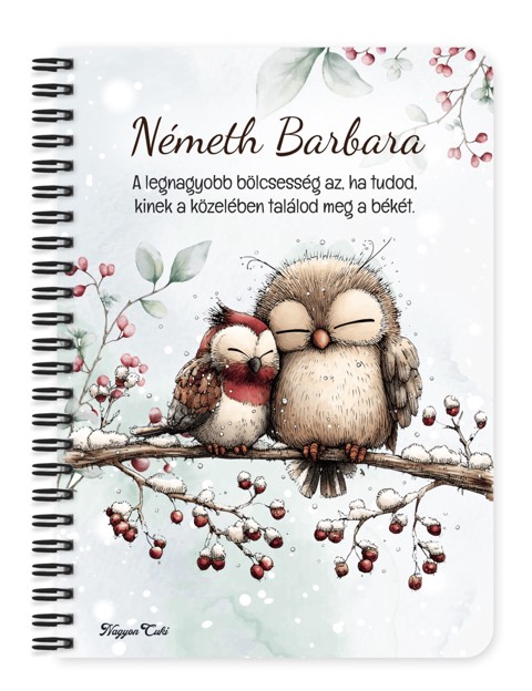 Névvel & Idézettel Kérhető Cuki téli baglyocskák Füzet / Napló | Névre Szóló téli Ajándék & Személyes Jegyzetfüzet | nagyoncuki.hu Képzeld el azt a mosolyt és az ünnepi ihletet, amikor egy olyan füzetet tartasz a kezedben, amely nemcsak a teendőid és jegyzeteid rendszerezésére szolgál, hanem az ünnepi készülődés örömét is tükrözi! Ez a különleges, névre szóló, egyedi tervezésű Cuki téli bagoly füzet a meghitt kuckózás, a kreativitás és az Erdei Varázs kollekció elragadó ünnepi darabja. Egy apró, szeretetteljes gesztus, amely a tervezést, a munkát és a jegyzetelést is fénnyel tölti meg, inspirációt adva minden sorhoz. Kiváló ajándék ötlet karácsonyra – legyen szó nőről, férfiról, vagy gyermekről – aki értékeli a személyes és lélekemelő meglepetéseket! Ezt a bájos füzetet mi magunk, a nagyoncuki.hu csapata terveztük, így biztos lehetsz benne, hogy egy igazán egyedi, magyar és személyre szabható ajándék darabbal leped meg szeretteidet vagy magadat! Miért válaszd ezt a személyre szabható a cuki téli bagoly mintás füzetet? Egyedi Ünnepi Design: A füzet designja szeretettel készült, kifejezetten a bagoly, a karácsony és az Erdei Varázs kollekció szerelmesei számára. Igazi téli ajándék különlegesség! Személyre szabható: Tedd még különlegesebbé az ajándékot a megajándékozott nevével! Egy igazán névre szóló füzet élmény, ami azt üzeni: "Ez csak a tied, tervezd meg benne a csodát!". Praktikus és Minőségi: A füzet két méretben (A5 és A6) elérhető. A strapabíró spirálkötés és a 60 minőségi, vonalas lap (120 oldal) gondoskodik a kényelmes használatról. Extra Meglepetés: Minden füzethez egy ajándék post-it szett is jár, hogy a legfontosabb gondolatok mindig szem előtt lehessenek. Tökéletes Ajándék Karácsonyra: Legyen szó Mikulásról, téli meglepetésről, ez a névvel ellátott füzet mindig telitalálat! Kinek ideális ajándék ez a cuki téli bagoly mintás füzet? Bagoly Rajongóknak és a Készülődés Kedvelőinek: Mindenkinek, aki az állatokat, az ünnepet és a bájos, Erdei Varázs stílus rajongója. A Tervezés és Naplóírás Kedvelőinek:Akik szeretnék rendszerezni a gondolataikat, ajándéklistájukat egy szép téli jegyzetfüzetben. Egyedi és személyes ajándékot keresőknek: Ha valami igazán különlegeset és névre szólót szeretnél adni. Hol használhatod ezt a cuki téli bagoly mintás füzetet: téli Készülődés: Menü, ajándéklista, vendéglista írására Otthon: Naplóírásra, jegyzetelésre, receptek gyűjtésére vagy ünnepi emlékek, élmények rögzítésére. Irodában/Suliban: Jegyzeteléshez, határidők rögzítéséhez – hogy az ünnepi hangulat a munkába is elkísérjen. Termékjellemzők: Méretek: Választható A5 (kb. 13,5 cm x 21 cm) vagy A6 (kb. 10,5 cm x 14,5 cm) Borító: Személyre szabható névvel és/vagy egyedi idézettel, matt felülettel Belső: Kb. 60 csíkos lap (120 oldal), tetején "memo" és "Subject" segédlettel Kötés: Praktikus és tartós fekete fémspirál Extra: Ajándék post-it szett a füzet elején Egyedi felirattal is kérhető: Ne felejtsd el megadni a kért nevet és/vagy az egyedi idézetet a megjegyzés rovatban rendeléskor! Lepd meg a szerettedet, barátodat, kollégádat vagy saját magadat ezzel a bájos és személyre szabott füzettel! Rendeld meg most ezt az egyedi, névre szóló téli bagoly füzetet, és vigyél egy kis extra téli örömet és inspirációt a mindennapokba!...mert mindenkinek jár egy kis cukiság. Ha tetszik neked ez az igazán aranyos dizájn, és tetszenek a személyre szabható ajándék ötleteink, nézd meg az Erdei varázs kollekciónkat is a nagyoncuki.hu-n!