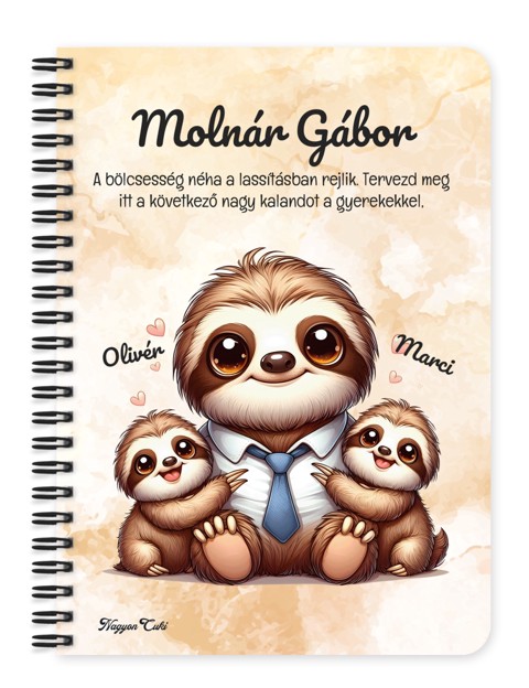 Névvel & Idézettel Kérhető Cuki lajhár Nyakkendős Apa és két gyerek mintás Füzet | Névre Szóló Ajándék Apáknak & Személyes Jegyzetfüzet | nagyoncuki.hu Képzeld el Apát egy nehéz munkanapon, vagy amikor épp a család jövőjét tervezi. Kiveszi a táskájából ezt a füzetet, és mielőtt kinyitná, megpillantja a borítót: a nagy, erős lajhárt (Önmagát), akin ott lógnak a kis lajhárok (a Ti gyermekeitek), és alatta az az idézet, amit Ti választottatok neki. Abban a pillanatban a munka nem csak munka többé. Hanem cél. Mert eszébe jut, hogy kikért csinálja mindezt! Ezt a mindennapi erőt és motivációt zártuk ebbe a Cuki Lajhár Apa füzetbe. Ez a füzet a "Biztonságos Fa" szimbóluma. Azt üzeni, hogy bárhogy is pörög a világ, Apa nyugalma és szeretete az, ami összetartja a családot! A grafikán a büszke apa lajhár látható az ölelő kicsikkel. A személyre szabható idézet (pl. "A világ legjobb Apukájának" vagy "Te vagy a mi hősünk") pedig megkoronázza az ajándékot. Ezt a terméket mi, a nagyoncuki.hu csapata terveztük, hogy Apa minden gondolata és terve a legjobb helyen legyen Miért válaszd ezt a személyre szabható lajhár apa mintás füzetet? Kettős Személyre Szabás: Nemcsak a neveket kérheted rá (Apa + Gyerekek), hanem egy egyedi idézetet vagy üzenetet is! Így válik ez a füzet egy személyes levéllé, amit mindig magánál hordhat. Motiváció a hétköznapokban: Legyen szó munkahelyi értekezletről vagy otthoni barkácstervekről, ez a füzet mindig emlékezteti a legfontosabbakra Praktikus és Minőségi: A füzet két méretben (A5 és A6) elérhető. A strapabíró spirálkötés és a 60 minőségi, vonalas lap (120 oldal) gondoskodik a kényelmes használatról. Extra Meglepetés: Minden füzethez egy ajándék post-it szett is jár, hogy a legfontosabb gondolatok mindig szem előtt lehessenek.Tökéletes Ajándék: Apák napjára, születésnapra, karácsonyra – vagy bármikor, amikor szeretnéd, hogy érezze a támogatásotokat. Termékjellemzők: Méretek: Választható A5 (kb. 13,5 cm x 21 cm) vagy A6 (kb. 10,5 cm x 14,5 cm) Borító: Személyre szabható névvel és/vagy egyedi idézettel, matt felülettel Belső: Kb. 60 csíkos lap (120 oldal), tetején "memo" és "Subject" segédlettel Kötés: Praktikus és tartós fekete fémspirál Extra: Ajándék post-it szett a füzet elején Egyedi felirattal is kérhető: Ne felejtsd el megadni a kért nevet és/vagy az egyedi idézetet. Vidd haza ezt a szeretet-hordozó füzetet, és adj Apának helyet a nagy tervekhez és a szép emlékekhez! Ha tetszik neked ez az igazán aranyos dizájn, és tetszenek a személyre szabható ajándék ötleteink, nézd meg a Cuki lajhárok kollekciónkat is a nagyoncuki.hu-n!
