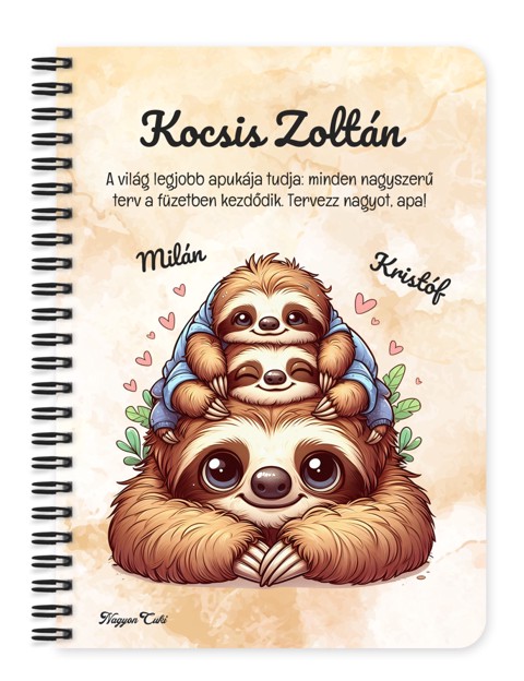 Névvel & Idézettel Kérhető Cuki lajhár Apa és két gyerek - Kicsi a rakás mintás Füzet | Névre Szóló Ajándék Apáknak & Személyes Jegyzetfüzet | nagyoncuki.hu Képzeld el Apát egy nehéz munkanapon, vagy amikor épp a család jövőjét tervezi. Kiveszi a táskájából ezt a füzetet, és mielőtt kinyitná, megpillantja a borítót: a nagy, erős lajhárt (Önmagát), akin ott lógnak a kis lajhárok (a Ti gyermekeitek), és alatta az az idézet, amit Ti választottatok neki. Abban a pillanatban a munka nem csak munka többé. Hanem cél. Mert eszébe jut, hogy kikért csinálja mindezt! Ezt a mindennapi erőt és motivációt zártuk ebbe a Cuki Lajhár Apa füzetbe. Ez a füzet a "Biztonságos Fa" szimbóluma. Azt üzeni, hogy bárhogy is pörög a világ, Apa nyugalma és szeretete az, ami összetartja a családot! A grafikán a büszke apa lajhár látható az ölelő kicsikkel. A személyre szabható idézet (pl. "A világ legjobb Apukájának" vagy "Te vagy a mi hősünk") pedig megkoronázza az ajándékot. Ezt a terméket mi, a nagyoncuki.hu csapata terveztük, hogy Apa minden gondolata és terve a legjobb helyen legyen Miért válaszd ezt a személyre szabható lajhár apa mintás füzetet? Kettős Személyre Szabás: Nemcsak a neveket kérheted rá (Apa + Gyerekek), hanem egy egyedi idézetet vagy üzenetet is! Így válik ez a füzet egy személyes levéllé, amit mindig magánál hordhat. Motiváció a hétköznapokban: Legyen szó munkahelyi értekezletről vagy otthoni barkácstervekről, ez a füzet mindig emlékezteti a legfontosabbakra Praktikus és Minőségi: A füzet két méretben (A5 és A6) elérhető. A strapabíró spirálkötés és a 60 minőségi, vonalas lap (120 oldal) gondoskodik a kényelmes használatról. Extra Meglepetés: Minden füzethez egy ajándék post-it szett is jár, hogy a legfontosabb gondolatok mindig szem előtt lehessenek.Tökéletes Ajándék: Apák napjára, születésnapra, karácsonyra – vagy bármikor, amikor szeretnéd, hogy érezze a támogatásotokat. Termékjellemzők: Méretek: Választható A5 (kb. 13,5 cm x 21 cm) vagy A6 (kb. 10,5 cm x 14,5 cm) Borító: Személyre szabható névvel és/vagy egyedi idézettel, matt felülettel Belső: Kb. 60 csíkos lap (120 oldal), tetején "memo" és "Subject" segédlettel Kötés: Praktikus és tartós fekete fémspirál Extra: Ajándék post-it szett a füzet elején Egyedi felirattal is kérhető: Ne felejtsd el megadni a kért nevet és/vagy az egyedi idézetet. Vidd haza ezt a szeretet-hordozó füzetet, és adj Apának helyet a nagy tervekhez és a szép emlékekhez! Ha tetszik neked ez az igazán aranyos dizájn, és tetszenek a személyre szabható ajándék ötleteink, nézd meg a Cuki lajhárok kollekciónkat is a nagyoncuki.hu-n!