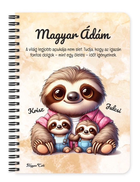 Névvel & Idézettel Kérhető Cuki lajhár Apa és két kis lajhár mintás Füzet | Névre Szóló Ajándék Apáknak & Személyes Jegyzetfüzet | nagyoncuki.hu Képzeld el Apát egy nehéz munkanapon, vagy amikor épp a család jövőjét tervezi. Kiveszi a táskájából ezt a füzetet, és mielőtt kinyitná, megpillantja a borítót: a nagy, erős lajhárt (Önmagát), akin ott lógnak a kis lajhárok (a Ti gyermekeitek), és alatta az az idézet, amit Ti választottatok neki. Abban a pillanatban a munka nem csak munka többé. Hanem cél. Mert eszébe jut, hogy kikért csinálja mindezt! Ezt a mindennapi erőt és motivációt zártuk ebbe a Cuki Lajhár Apa füzetbe. Ez a füzet a "Biztonságos Fa" szimbóluma. Azt üzeni, hogy bárhogy is pörög a világ, Apa nyugalma és szeretete az, ami összetartja a családot! A grafikán a büszke apa lajhár látható az ölelő kicsikkel. A személyre szabható idézet (pl. "A világ legjobb Apukájának" vagy "Te vagy a mi hősünk") pedig megkoronázza az ajándékot. Ezt a terméket mi, a nagyoncuki.hu csapata terveztük, hogy Apa minden gondolata és terve a legjobb helyen legyen Miért válaszd ezt a személyre szabható lajhár apa mintás füzetet? Kettős Személyre Szabás: Nemcsak a neveket kérheted rá (Apa + Gyerekek), hanem egy egyedi idézetet vagy üzenetet is! Így válik ez a füzet egy személyes levéllé, amit mindig magánál hordhat. Motiváció a hétköznapokban: Legyen szó munkahelyi értekezletről vagy otthoni barkácstervekről, ez a füzet mindig emlékezteti a legfontosabbakra Praktikus és Minőségi: A füzet két méretben (A5 és A6) elérhető. A strapabíró spirálkötés és a 60 minőségi, vonalas lap (120 oldal) gondoskodik a kényelmes használatról. Extra Meglepetés: Minden füzethez egy ajándék post-it szett is jár, hogy a legfontosabb gondolatok mindig szem előtt lehessenek.Tökéletes Ajándék: Apák napjára, születésnapra, karácsonyra – vagy bármikor, amikor szeretnéd, hogy érezze a támogatásotokat. Termékjellemzők: Méretek: Választható A5 (kb. 13,5 cm x 21 cm) vagy A6 (kb. 10,5 cm x 14,5 cm) Borító: Személyre szabható névvel és/vagy egyedi idézettel, matt felülettel Belső: Kb. 60 csíkos lap (120 oldal), tetején "memo" és "Subject" segédlettel Kötés: Praktikus és tartós fekete fémspirál Extra: Ajándék post-it szett a füzet elején Egyedi felirattal is kérhető: Ne felejtsd el megadni a kért nevet és/vagy az egyedi idézetet. Vidd haza ezt a szeretet-hordozó füzetet, és adj Apának helyet a nagy tervekhez és a szép emlékekhez! Ha tetszik neked ez az igazán aranyos dizájn, és tetszenek a személyre szabható ajándék ötleteink, nézd meg a Cuki lajhárok kollekciónkat is a nagyoncuki.hu-n!