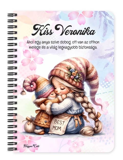 Névvel & Idézettel Kérhető Cuki Anya manó & Lánya mintás Füzet | Névre Szóló Ajándék Anyáknak & Személyes Jegyzetfüzet | nagyoncuki.hu Gondoltál már arra, mennyi minden van egy Édesanya fejében? Bevásárlólisták, születésnapi dátumok, a gyerekek különórái, a karácsonyi menü, és ezer apró gondoskodó részlet, amivel a családot működteti. De hol van ebben a sok gondoskodásban Ő maga? Az Anyukák hajlamosak mindent és mindenkit maguk elé sorolni. Éppen ezért a legszebb ajándék, amit adhatsz neki, az a figyelem és a saját tér! Ezt az üzenetet zártuk ebbe a Cuki Anya Manó füzetbe. Ez a füzet nem csupán egy jegyzetfüzet. Ez egy főhajtás Anya előtt. Amikor kézbe veszi ezt a bájos, névre szóló füzetet, a rajta lévő gondoskodó Anya Manó emlékeztetni fogja: "Látjuk, mennyi mindent teszel értünk. Értékeljük a szeretetedet. Ez most a Te helyed, a Te gondolataidnak." A grafikán egy tündéri, gondoskodó anya manó látható, aki melegséget és otthonosságot áraszt. A személyre szabhatóság (név + esetleg egy rövid "Szeretünk, Anya" felirat) pedig könnyekig ható ajándékká varázsolja ezt a hétköznapi tárgyat. Ezt a terméket mi, a nagyoncuki.hu csapata terveztük, hogy visszaadhassunk valamit abból a sok jóból, amit az édesanyák adnak a világnak. Miért válaszd ezt a személyre szabható cuki anya manó mintás füzetet? Az "Énidő" szimbóluma: Ez a füzet csak az Övé. Nem a leckéé, nem a munkáé. Hanem az Ő álmaié, receptjeié vagy naplójáé. Érzelmi Elismerés: A minta és a névválasztás azt üzeni: "Te vagy a legfontosabb Manó az életünkben." Személyre szabható: Kérd az Édesanya keresztnevével, vagy "Anya", "Mama", "Nagyi" felirattal és ha akarod cseréld le az idézetet is! :) Praktikus és Minőségi: A füzet két méretben (A5 és A6) elérhető. A strapabíró spirálkötés és a 60 minőségi, vonalas lap (120 oldal) gondoskodik a kényelmes használatról. Extra Meglepetés: Minden füzethez egy ajándék post-it szett is jár, hogy a legfontosabb gondolatok mindig szem előtt lehessenek.Tökéletes Ajándék: Apák napjára, születésnapra, karácsonyra – vagy bármikor, amikor szeretnéd, hogy érezze a támogatásotokat. Tökéletes Ajándék: Anyák napjára, karácsonyra, születésnapra – vagy bármikor, amikor szeretnéd megköszönni, hogy Ő van nektek. Termékjellemzők: Méretek: Választható A5 (kb. 13,5 cm x 21 cm) vagy A6 (kb. 10,5 cm x 14,5 cm) Borító: Személyre szabható névvel és/vagy egyedi idézettel, matt felülettel Belső: Kb. 60 csíkos lap (120 oldal), tetején "memo" és "Subject" segédlettel Kötés: Praktikus és tartós fekete fémspirál Extra: Ajándék post-it szett a füzet elején Egyedi felirattal is kérhető: Ne felejtsd el megadni a kért nevet és/vagy az egyedi idézetet. Vidd haza ezt a szeretet-hordozó füzetet, és szerezz vele boldog pillanatokat a család lelkének! Ha tetszik neked ez az igazán aranyos dizájn, és tetszenek a személyre szabható ajándék ötleteink, nézd meg a Cuki manók kollekciónkat is a nagyoncuki.hu-n!