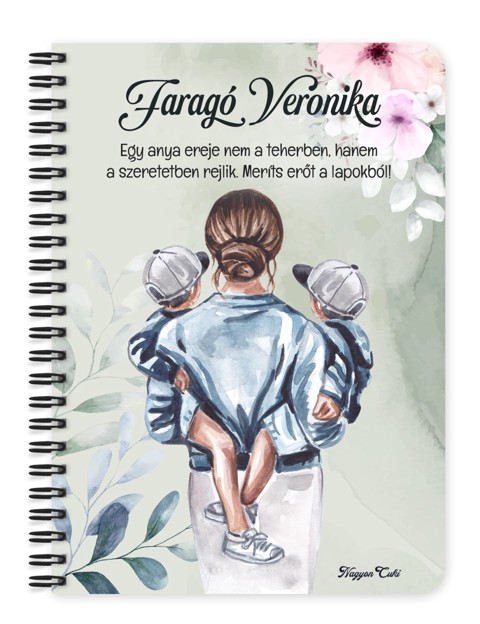Névvel & Idézettel Kérhető Anya és Kicsi Fiai mintás Füzet | Névre Szóló Ajándék Anyáknak & Személyes Jegyzetfüzet | nagyoncuki.hu Gondoltál már arra, mennyi minden van egy Édesanya fejében? Bevásárlólisták, születésnapi dátumok, a gyerekek különórái, a karácsonyi menü, és ezer apró gondoskodó részlet, amivel a családot működteti. De hol van ebben a sok gondoskodásban Ő maga? Az Anyukák hajlamosak mindent és mindenkit maguk elé sorolni. Éppen ezért a legszebb ajándék, amit adhatsz neki, az a figyelem és a saját tér! Ezt az üzenetet zártuk ebbe a Családom Kollekciós Anya füzetbe. Ez a füzet nem csupán egy jegyzetfüzet. Ez egy főhajtás Anya előtt. Amikor kézbe veszi ezt a bájos, névre szóló füzetet, a rajta lévő kedves Anya figura emlékeztetni fogja: "Látjuk, mennyi mindent teszel értünk. Értékeljük a szeretetedet. Ez most a Te helyed, a Te gondolataidnak." A grafikán egy szeretnivaló, a Családom kollekcióra jellemző bájos anya karakter látható, aki a család melegét jelképezi. A személyre szabhatóság (név + esetleg egy rövid "Szeretünk, Anya" vagy "A legjobb Anya" felirat) pedig könnyekig ható ajándékká varázsolja ezt a hétköznapi tárgyat. Ezt a terméket mi, a nagyoncuki.hu csapata terveztük, hogy visszaadhassunk valamit abból a sok jóból, amit az édesanyák adnak a világnak. Miért válaszd ezt a személyre szabható szépséges anya mintás füzetet? Az "Énidő" szimbóluma: Ez a füzet csak az Övé. Nem a leckéé, nem a munkáé. Hanem az Ő álmaié, receptjeié vagy naplójáé. Érzelmi Elismerés: A minta és a névválasztás azt üzeni: "Te vagy a legfontosabb a Családban." Személyre szabható: Kérd az Édesanya keresztnevével, vagy "Anya", "Mama", "Nagyi" felirattal és ha akarod cseréld le az idézetet is! :) Praktikus és Minőségi: A füzet két méretben (A5 és A6) elérhető. A strapabíró spirálkötés és a 60 minőségi, vonalas lap (120 oldal) gondoskodik a kényelmes használatról. Extra Meglepetés: Minden füzethez egy ajándék post-it szett is jár, hogy a legfontosabb gondolatok mindig szem előtt lehessenek.Tökéletes Ajándék: Apák napjára, születésnapra, karácsonyra – vagy bármikor, amikor szeretnéd, hogy érezze a támogatásotokat. Tökéletes Ajándék: Anyák napjára, karácsonyra, születésnapra – vagy bármikor, amikor szeretnéd megköszönni, hogy Ő van nektek. Termékjellemzők: Méretek: Választható A5 (kb. 13,5 cm x 21 cm) vagy A6 (kb. 10,5 cm x 14,5 cm) Borító: Személyre szabható névvel és/vagy egyedi idézettel, matt felülettel Belső: Kb. 60 csíkos lap (120 oldal), tetején "memo" és "Subject" segédlettel Kötés: Praktikus és tartós fekete fémspirál Extra: Ajándék post-it szett a füzet elején Egyedi felirattal is kérhető: Ne felejtsd el megadni a kért nevet és/vagy az egyedi idézetet. Vidd haza ezt a szeretet-hordozó füzetet, és szerezz vele boldog pillanatokat a család lelkének! Ha tetszik neked ez az igazán aranyos dizájn, és tetszenek a személyre szabható ajándék ötleteink, nézd meg a Családom kollekciónkat is a nagyoncuki.hu-n!
