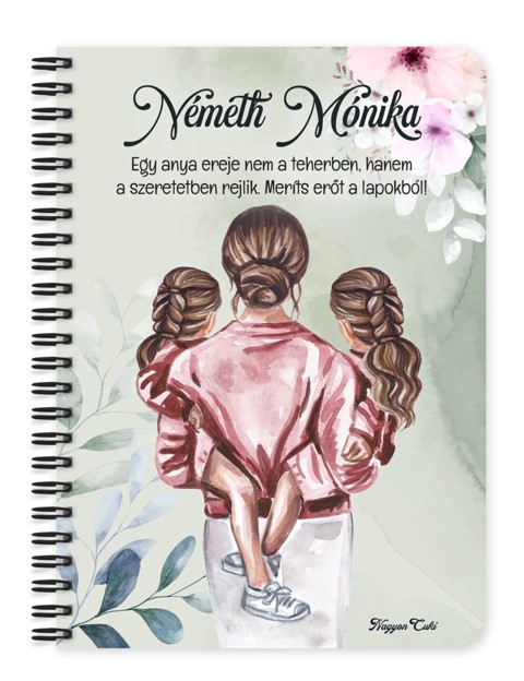 Névvel & Idézettel Kérhető Anya és a Lánykái mintás Füzet | Névre Szóló Ajándék Anyáknak & Személyes Jegyzetfüzet | nagyoncuki.hu Gondoltál már arra, mennyi minden van egy Édesanya fejében? Bevásárlólisták, születésnapi dátumok, a gyerekek különórái, a karácsonyi menü, és ezer apró gondoskodó részlet, amivel a családot működteti. De hol van ebben a sok gondoskodásban Ő maga? Az Anyukák hajlamosak mindent és mindenkit maguk elé sorolni. Éppen ezért a legszebb ajándék, amit adhatsz neki, az a figyelem és a saját tér! Ezt az üzenetet zártuk ebbe a Családom Kollekciós Anya füzetbe. Ez a füzet nem csupán egy jegyzetfüzet. Ez egy főhajtás Anya előtt. Amikor kézbe veszi ezt a bájos, névre szóló füzetet, a rajta lévő kedves Anya figura emlékeztetni fogja: "Látjuk, mennyi mindent teszel értünk. Értékeljük a szeretetedet. Ez most a Te helyed, a Te gondolataidnak." A grafikán egy szeretnivaló, a Családom kollekcióra jellemző bájos anya karakter látható, aki a család melegét jelképezi. A személyre szabhatóság (név + esetleg egy rövid "Szeretünk, Anya" vagy "A legjobb Anya" felirat) pedig könnyekig ható ajándékká varázsolja ezt a hétköznapi tárgyat. Ezt a terméket mi, a nagyoncuki.hu csapata terveztük, hogy visszaadhassunk valamit abból a sok jóból, amit az édesanyák adnak a világnak. Miért válaszd ezt a személyre szabható szépséges anya mintás füzetet? Az "Énidő" szimbóluma: Ez a füzet csak az Övé. Nem a leckéé, nem a munkáé. Hanem az Ő álmaié, receptjeié vagy naplójáé. Érzelmi Elismerés: A minta és a névválasztás azt üzeni: "Te vagy a legfontosabb a Családban." Személyre szabható: Kérd az Édesanya keresztnevével, vagy "Anya", "Mama", "Nagyi" felirattal és ha akarod cseréld le az idézetet is! :) Praktikus és Minőségi: A füzet két méretben (A5 és A6) elérhető. A strapabíró spirálkötés és a 60 minőségi, vonalas lap (120 oldal) gondoskodik a kényelmes használatról. Extra Meglepetés: Minden füzethez egy ajándék post-it szett is jár, hogy a legfontosabb gondolatok mindig szem előtt lehessenek.Tökéletes Ajándék: Apák napjára, születésnapra, karácsonyra – vagy bármikor, amikor szeretnéd, hogy érezze a támogatásotokat. Tökéletes Ajándék: Anyák napjára, karácsonyra, születésnapra – vagy bármikor, amikor szeretnéd megköszönni, hogy Ő van nektek. Termékjellemzők: Méretek: Választható A5 (kb. 13,5 cm x 21 cm) vagy A6 (kb. 10,5 cm x 14,5 cm) Borító: Személyre szabható névvel és/vagy egyedi idézettel, matt felülettel Belső: Kb. 60 csíkos lap (120 oldal), tetején "memo" és "Subject" segédlettel Kötés: Praktikus és tartós fekete fémspirál Extra: Ajándék post-it szett a füzet elején Egyedi felirattal is kérhető: Ne felejtsd el megadni a kért nevet és/vagy az egyedi idézetet. Vidd haza ezt a szeretet-hordozó füzetet, és szerezz vele boldog pillanatokat a család lelkének! Ha tetszik neked ez az igazán aranyos dizájn, és tetszenek a személyre szabható ajándék ötleteink, nézd meg a Családom kollekciónkat is a nagyoncuki.hu-n!