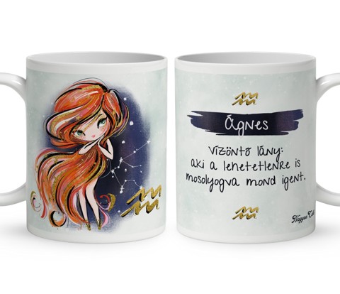 Személyre szabható - Vörös hajú Csini Vízöntő lány mintás Zodiákus Bögre | Egyedi Horoszkópos Ajándék a Csillogás jegyében | nagyoncuki.hu Tudod, mi teszi igazán különlegessé a Vízöntő hölgyeket? Az a megfoghatatlan szabadságvágy, az eredetiség és az a belső ragyogás, amivel minden társaságot feldobnak. Ők azok a modern álmodozók, akik nem félnek önmaguk lenni, és akiknek a kreativitása nem ismer határokat. Egy Vízöntő nő nem csak a földön jár, de a csillagok között is otthon érzi magát. Ezt a vibráló, stílusos és „csili-vili” életérzést zártuk ebbe a Csini Vízöntő lányos bögrébe. Ez nem egy egyszerű ajándéktárgy. Ez egy elismerő mosoly a reggeli kávé mellé. Amikor a tulajdonosa a kezébe veszi ezt a bögrét, és meglátja rajta a saját karakterét, a saját nevét vagy a kedvenc idézetét, tudni fogja:"Különleges vagyok, és valaki pontosan ilyennek szeret engem.". A legszebb módja annak, hogy elmondd neki: Ragyogj tovább, te csillaglány! Ezt a bájos bögrét mi magunk, a nagyoncuki.hu csapata terveztük, kifejezetten aa nőknek, akik imádják a stílust és a személyes figyelmességet. :) Miért válaszd ezt a személyre szabható Vízöntő lányos bögrét? Mély Érzelmi Üzenet: Az igazi ajándék nem egy naptári napnak, hanem a személynek szól. Ez a bögre azt üzeni: „Ismerem a lelked apró csillogásait, és tudom, mi tesz téged igazán egyedivé.” A horoszkóp és a személyre szabott karakter kombinációja a legszebb módja annak, hogy kifejezd: figyelsz a másikra, és fontos neked az, aki ő valójában. Hiszen az ajándékok a szeretet és a törődés hordozói az év minden napján. Teljesen Személyre szabható: A paramétereknél kiválaszthatod a lány bőrszínét és szemszínét is, a bögre másik oldalát pedig névvel és egyedi idézettel teheted megismételhetetlenné. Minőségi anyag: A bögre tartós kerámiából készült, így hosszú ideig megőrzi a rá nyomtatott kedves mintát és az élénk színeit. Praktikus ajándék: A bögre nem csupán egy dísztárgy, hanem egy hasznos és a mindennapokban is örömmel használt ajándék, ami mindig emlékeztet a figyelmességedre és a szeretet erejére. Tökéletes Ajándék: ASzületésnapra, névnapra, barátnőnek, testvérnek vagy akár saját magadnak – mert megérdemled a kényeztetés! Termékjellemzők: Űrtartalom: 3 dl (kb. 300-330ml) fehér kerámia bögre, kívül mintával Anyag: 100% prémium minőségű kerámia Kezelés: Mosogatógépben mosható és mikrohullámú sütőben is használható a hosszan tartó minta érdekében. Személyre szabás: Választható bőrszín, szemszín + Névvel és idézettel kérhető. Elérhető szín: Klasszikus fehér, amelyen a minta gyönyörűen érvényesül.