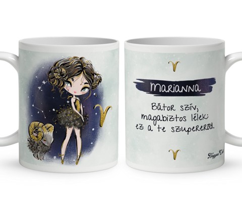 Személyre szabható - Barna hajú Csini Kos lány mintás Zodiákus Bögre | Egyedi Horoszkópos Ajándék a Csillogás jegyében | nagyoncuki.hu Tudod, mi teszi igazán különlegessé a Kos hölgyeket? Az a hihetetlen bátorság, a végtelen energia és az a belső tűz, amivel minden céljukat elérik. Ők igazi vezetők, akik lelkesedésükkel mindenkit magukkal ragadnak, és nem félnek új utakra lépni. Egy Kos nő nem csak álmodozik a sikerről, hanem minden erejével tesz is érte. Ezt a vibráló, stílusos és „csili-vili” életérzést zártuk ebbe a Csini Kos lányos bögrébe. Ez nem egy egyszerű ajándéktárgy. Ez egy elismerő mosoly a reggeli kávé mellé. Amikor a tulajdonosa a kezébe veszi ezt a bögrét, és meglátja rajta a saját karakterét, a saját nevét vagy a kedvenc idézetét, tudni fogja:"Különleges vagyok, és valaki pontosan ilyennek szeret engem.". A legszebb módja annak, hogy elmondd neki: Ragyogj tovább, te csillaglány! Ezt a bájos bögrét mi magunk, a nagyoncuki.hu csapata terveztük, kifejezetten aa nőknek, akik imádják a stílust és a személyes figyelmességet. :) Miért válaszd ezt a személyre szabható Kos lányos bögrét? Mély Érzelmi Üzenet: Az igazi ajándék nem egy naptári napnak, hanem a személynek szól. Ez a bögre azt üzeni: „Ismerem a lelked apró csillogásait, és tudom, mi tesz téged igazán egyedivé.” A horoszkóp és a személyre szabott karakter kombinációja a legszebb módja annak, hogy kifejezd: figyelsz a másikra, és fontos neked az, aki ő valójában. Hiszen az ajándékok a szeretet és a törődés hordozói az év minden napján. Teljesen Személyre szabható: A paramétereknél kiválaszthatod a lány bőrszínét és szemszínét is, a bögre másik oldalát pedig névvel és egyedi idézettel teheted megismételhetetlenné. Minőségi anyag: A bögre tartós kerámiából készült, így hosszú ideig megőrzi a rá nyomtatott kedves mintát és az élénk színeit. Praktikus ajándék: A bögre nem csupán egy dísztárgy, hanem egy hasznos és a mindennapokban is örömmel használt ajándék, ami mindig emlékeztet a figyelmességedre és a szeretet erejére. Tökéletes Ajándék: Születésnapra, névnapra, barátnőnek, testvérnek vagy akár saját magadnak – mert megérdemled a kényeztetés! Termékjellemzők: Űrtartalom: 3 dl (kb. 300-330ml) fehér kerámia bögre, kívül mintával Anyag: 100% prémium minőségű kerámia Kezelés: Mosogatógépben mosható és mikrohullámú sütőben is használható a hosszan tartó minta érdekében. Személyre szabás: Választható bőrszín, szemszín + Névvel és idézettel kérhető. Elérhető szín: Klasszikus fehér, amelyen a minta gyönyörűen érvényesül.