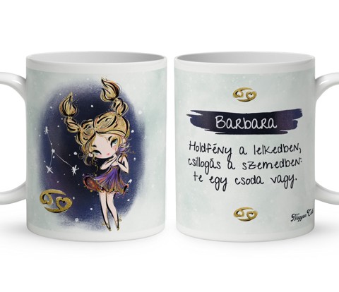 Személyre szabható - Szőke hajú Csini Rák lány mintás Zodiákus Bögre | Egyedi Horoszkópos Ajándék a Csillogás jegyében | nagyoncuki.hu Tudod, mi teszi igazán különlegessé a Rák hölgyeket? Az a végtelen empátia, a mély érzésvilág és az a természetes gondoskodás, amivel a szeretteiket körbeveszik. Ők a „lélek nagykövetei”, akiknek az otthon nem csak egy hely, hanem egy biztonságos menedék. Egy Rák nő képes a legapróbb gesztusokba is belecsempészni a szívét. Ezt a vibráló, stílusos és „csili-vili” életérzést zártuk ebbe a Csini Rák lányos bögrébe. Ez nem egy egyszerű ajándéktárgy. Ez egy elismerő mosoly a reggeli kávé mellé. Amikor a tulajdonosa a kezébe veszi ezt a bögrét, és meglátja rajta a saját karakterét, a saját nevét vagy a kedvenc idézetét, tudni fogja:"Különleges vagyok, és valaki pontosan ilyennek szeret engem.". A legszebb módja annak, hogy elmondd neki: Ragyogj tovább, te csillaglány! Ezt a bájos bögrét mi magunk, a nagyoncuki.hu csapata terveztük, kifejezetten aa nőknek, akik imádják a stílust és a személyes figyelmességet. :) Miért válaszd ezt a személyre szabható Rák lányos bögrét? Mély Érzelmi Üzenet: Az igazi ajándék nem egy naptári napnak, hanem a személynek szól. Ez a bögre azt üzeni: „Ismerem a lelked apró csillogásait, és tudom, mi tesz téged igazán egyedivé.” A horoszkóp és a személyre szabott karakter kombinációja a legszebb módja annak, hogy kifejezd: figyelsz a másikra, és fontos neked az, aki ő valójában. Hiszen az ajándékok a szeretet és a törődés hordozói az év minden napján. Teljesen Személyre szabható: A paramétereknél kiválaszthatod a lány bőrszínét és szemszínét is, a bögre másik oldalát pedig névvel és egyedi idézettel teheted megismételhetetlenné. Minőségi anyag: A bögre tartós kerámiából készült, így hosszú ideig megőrzi a rá nyomtatott kedves mintát és az élénk színeit. Praktikus ajándék: A bögre nem csupán egy dísztárgy, hanem egy hasznos és a mindennapokban is örömmel használt ajándék, ami mindig emlékeztet a figyelmességedre és a szeretet erejére. Tökéletes Ajándék: Születésnapra, névnapra, barátnőnek, testvérnek vagy akár saját magadnak – mert megérdemled a kényeztetés! Termékjellemzők: Űrtartalom: 3 dl (kb. 300-330ml) fehér kerámia bögre, kívül mintával Anyag: 100% prémium minőségű kerámia Kezelés: Mosogatógépben mosható és mikrohullámú sütőben is használható a hosszan tartó minta érdekében. Személyre szabás: Választható bőrszín, szemszín + Névvel és idézettel kérhető. Elérhető szín: Klasszikus fehér, amelyen a minta gyönyörűen érvényesül.