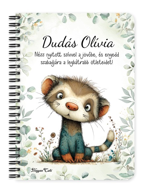 Névvel & Idézettel Kérhető - Játékos felfedező, a vadászgörény mintás Füzet / Napló | Névre Szóló Ajándék & Személyes Jegyzetfüzet | nagyoncuki.hu Gondoltál már arra, milyen jó érzés tavasszal tiszta lappal indulni? Ahogy a természet leveti a téli szürkeséget, bennünk is felébred a vágy az új célok, a friss gondolatok és a kreatív tervek iránt. Ezt az inspiráló, ébredező energiát zártuk bele ebbe a személyre szabható Cuki Tavaszi erdei állatos füzetbe, az Erdei Varázs kollekciónk legújabb darabjába! Ez a füzet nem csupán üres lapok gyűjteménye. Ez egy biztonságos hely az új kezdeteknek. A borítón szimatoló, téli álmából ébredő borz arra emlékeztet: itt az idő megvalósítani azokat az álmokat, amiket eddig csak dédelgettél! Egy gyönyörű, személyes ajándék, ami a szeretet hordozójaként azt üzeni: "Hiszek a terveidben, vágj bele!" Ezt a bájos füzetet mi magunk, a nagyoncuki.hu csapata terveztük, így biztos lehetsz benne, hogy egy igazán egyedi, magyar és személyre szabható ajándék darabbal leped meg szeretteidet vagy magadat! Miért válaszd ezt a személyre szabható tavaszi vadászgörény mintás füzetet? Kettős Személyre Szabás: Tedd igazán egyedivé! A borítóra nemcsak a megajándékozott nevét kérheted, hanem egy saját, motiváló idézetet is. Így válik egy egyszerű tárgyból féltve őrzött emlék. Minőségi Társ a Mindennapokban: Legyen szó munkahelyi teendőkről, egyetemi jegyzetekről vagy hálanapló írásáról, ez a füzet bírni fogja a tempót Praktikus és Minőségi: A füzet két méretben (A5 és A6) elérhető. A strapabíró spirálkötés és a 60 minőségi, vonalas lap (120 oldal) gondoskodik a kényelmes használatról. Extra Meglepetés: Minden füzethez egy ajándék post-it szett is jár, hogy a legfontosabb gondolatok mindig szem előtt lehessenek. Tökéletes Tavaszi Ajándék: Keresve sem találhatnál szívhez szólóbb meglepetést Nőnapra, Húsvétra, Anyák napjára, vagy egy új iskola, munkahely kezdésekor! Kinek ideális ajándék ez az aranyos vadászgörény mintás füzet? A Nagy Tervezőknek és Álmodozóknak: Akik imádnak listákat írni, célokat kitűzni, és szeretik, ha mindez egy gyönyörű helyen van összegyűjtve. Személyes Ajándékot Keresőknek: Ha valami igazán egyedit, figyelmeset szeretnél adni, ami garantáltan örömkönnyeket csal a szemekbe. Termékjellemzők: Méretek: Választható A5 (kb. 13,5 cm x 21 cm) vagy A6 (kb. 10,5 cm x 14,5 cm) Borító: Személyre szabható névvel és/vagy egyedi idézettel, matt felülettel Belső: Kb. 60 csíkos lap (120 oldal), tetején "memo" és "Subject" segédlettel Kötés: Praktikus és tartós fekete fémspirál Extra: Ajándék post-it szett a füzet elején Egyedi felirattal is kérhető: Ne felejtsd el megadni a kért nevet és/vagy az egyedi idézetet a megjegyzés rovatban rendeléskor! Vidd haza a tavasz frissességét! Rendeld meg most ezt az egyedi, névre szóló Cuki Tavaszi vadászgörény mintás füzetet, és adj teret a legszebb gondolatoknak...mert mindenkinek jár egy kis cukiság. Ha tetszik neked ez az igazán aranyos dizájn, és tetszenek a személyre szabható ajándék ötleteink, nézd meg az Erdei varázs kollekciónkat is a nagyoncuki.hu-n!