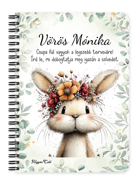 Névvel & Idézettel Kérhető - Tavasz hírnöke, a mezei nyuszi mintás Füzet / Napló | Névre Szóló Ajándék & Személyes Jegyzetfüzet | nagyoncuki.hu Gondoltál már arra, milyen jó érzés tavasszal tiszta lappal indulni? Ahogy a természet leveti a téli szürkeséget, bennünk is felébred a vágy az új célok, a friss gondolatok és a kreatív tervek iránt. Ezt az inspiráló, ébredező energiát zártuk bele ebbe a személyre szabható Cuki Tavaszi erdei állatos füzetbe, az Erdei Varázs kollekciónk legújabb darabjába! Ez a füzet nem csupán üres lapok gyűjteménye. Ez egy biztonságos hely az új kezdeteknek. A borítón szimatoló, téli álmából ébredő borz arra emlékeztet: itt az idő megvalósítani azokat az álmokat, amiket eddig csak dédelgettél! Egy gyönyörű, személyes ajándék, ami a szeretet hordozójaként azt üzeni: "Hiszek a terveidben, vágj bele!" Ezt a bájos füzetet mi magunk, a nagyoncuki.hu csapata terveztük, így biztos lehetsz benne, hogy egy igazán egyedi, magyar és személyre szabható ajándék darabbal leped meg szeretteidet vagy magadat! Miért válaszd ezt a személyre szabható tavaszi nyuszi mintás füzetet? Kettős Személyre Szabás: Tedd igazán egyedivé! A borítóra nemcsak a megajándékozott nevét kérheted, hanem egy saját, motiváló idézetet is. Így válik egy egyszerű tárgyból féltve őrzött emlék. Minőségi Társ a Mindennapokban: Legyen szó munkahelyi teendőkről, egyetemi jegyzetekről vagy hálanapló írásáról, ez a füzet bírni fogja a tempót Praktikus és Minőségi: A füzet két méretben (A5 és A6) elérhető. A strapabíró spirálkötés és a 60 minőségi, vonalas lap (120 oldal) gondoskodik a kényelmes használatról. Extra Meglepetés: Minden füzethez egy ajándék post-it szett is jár, hogy a legfontosabb gondolatok mindig szem előtt lehessenek. Tökéletes Tavaszi Ajándék: Keresve sem találhatnál szívhez szólóbb meglepetést Nőnapra, Húsvétra, Anyák napjára, vagy egy új iskola, munkahely kezdésekor! Kinek ideális ajándék ez az aranyos nyuszi mintás füzet? A Nagy Tervezőknek és Álmodozóknak: Akik imádnak listákat írni, célokat kitűzni, és szeretik, ha mindez egy gyönyörű helyen van összegyűjtve. Személyes Ajándékot Keresőknek: Ha valami igazán egyedit, figyelmeset szeretnél adni, ami garantáltan örömkönnyeket csal a szemekbe. Termékjellemzők: Méretek: Választható A5 (kb. 13,5 cm x 21 cm) vagy A6 (kb. 10,5 cm x 14,5 cm) Borító: Személyre szabható névvel és/vagy egyedi idézettel, matt felülettel Belső: Kb. 60 csíkos lap (120 oldal), tetején "memo" és "Subject" segédlettel Kötés: Praktikus és tartós fekete fémspirál Extra: Ajándék post-it szett a füzet elején Egyedi felirattal is kérhető: Ne felejtsd el megadni a kért nevet és/vagy az egyedi idézetet a megjegyzés rovatban rendeléskor! Vidd haza a tavasz frissességét! Rendeld meg most ezt az egyedi, névre szóló Cuki Tavaszi nyuszi mintás füzetet, és adj teret a legszebb gondolatoknak...mert mindenkinek jár egy kis cukiság. Ha tetszik neked ez az igazán aranyos dizájn, és tetszenek a személyre szabható ajándék ötleteink, nézd meg az Erdei varázs kollekciónkat is a nagyoncuki.hu-n!