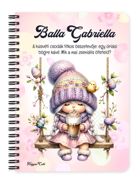 Névvel & Idézettel Kérhető - Kávézós Húsvéti manólány mintás Füzet / Napló | Névre Szóló Ajándék & Személyes Jegyzetfüzet | nagyoncuki.hu Gondoltál már arra, mit is jelentenek valójában az ünnepi ajándékok? A tavasz és a húsvét a megújulás, az újjászületés és a családi együttlétek csodás időszaka. Amikor apróságokat rejtünk a nyuszifészekbe, azokkal valójában a szeretetünket fejezzük ki a másik iránt. Az ajándékok pusztán ezeknek az őszinte, mély érzéseknek a hordozói. Egy csokinyuszi édes, de hamar elfogy – ez a személyre szabható Aranyos Húsvéti Manó füzet viszont egy olyan maradandó üzenet, ami egész évben a megajándékozottal marad. Ezt a bájos füzetet mi magunk, a nagyoncuki.hu csapata terveztük, így biztos lehetsz benne, hogy egy igazán egyedi, magyar és személyre szabható ajándék darabbal leped meg szeretteidet vagy magadat! Miért válaszd ezt a személyre szabható húsvéti manós mintás füzetet? A Szeretet Hordozója: Nem csupán egy jegyzetfüzetet adsz, hanem egy személyes érzelmi üzenetet. A név és a saját idézet teszi ezt a tárgyat egy igazi, lelket melengető kincsé. Cukormentes, Maradandó Öröm: Tökéletes alternatívája vagy kiegészítője az édességeknek. Egy ajándék, ami nem fogy el az ünnepek után, hanem a mindennapok részévé válik. Elbűvölő Tavaszi Dizájn: A nyuszifüles, húsvéti manó azonnal megteremti az ünnepi hangulatot, és garantáltan mosolyt csal mindenki arcára Praktikus és Minőségi: A füzet két méretben (A5 és A6) elérhető. A strapabíró spirálkötés és a 60 minőségi, vonalas lap (120 oldal) gondoskodik a kényelmes használatról. Extra Meglepetés: Minden füzethez egy ajándék post-it szett is jár, hogy a legfontosabb gondolatok mindig szem előtt lehessenek. Tökéletes Ajándék Mindenkinek: Kislányoknak a nyuszifészekbe, édesanyáknak és nagymamáknak a receptekhez, vagy a locsolóknak egy kedves, egyedi meglepetésként. Termékjellemzők: Méretek: Választható A5 (kb. 13,5 cm x 21 cm) vagy A6 (kb. 10,5 cm x 14,5 cm) Borító: Személyre szabható névvel és/vagy egyedi idézettel, matt felülettel Belső: Kb. 60 csíkos lap (120 oldal), tetején "memo" és "Subject" segédlettel Kötés: Praktikus és tartós fekete fémspirál Extra: Ajándék post-it szett a füzet elején Egyedi felirattal is kérhető: Ne felejtsd el megadni a kért nevet és/vagy az egyedi idézetet a megjegyzés rovatban rendeléskor! Rejts egy igazán különleges, szívből jövő meglepetést az idei nyuszifészekbe! Rendeld meg most ezt az egyedi, névre szóló Cuki húsvéti manó mintás füzetet, és ajándékozz vele maradandó tavaszi mosolyt...mert mindenkinek jár egy kis cukiság.