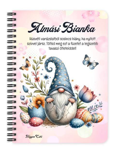 Névvel & Idézettel Kérhető - Pillangós Húsvéti manó mintás Füzet / Napló | Névre Szóló Ajándék & Személyes Jegyzetfüzet | nagyoncuki.hu Gondoltál már arra, mit is jelentenek valójában az ünnepi ajándékok? A tavasz és a húsvét a megújulás, az újjászületés és a családi együttlétek csodás időszaka. Amikor apróságokat rejtünk a nyuszifészekbe, azokkal valójában a szeretetünket fejezzük ki a másik iránt. Az ajándékok pusztán ezeknek az őszinte, mély érzéseknek a hordozói. Egy csokinyuszi édes, de hamar elfogy – ez a személyre szabható Aranyos Húsvéti Manó füzet viszont egy olyan maradandó üzenet, ami egész évben a megajándékozottal marad. Ezt a bájos füzetet mi magunk, a nagyoncuki.hu csapata terveztük, így biztos lehetsz benne, hogy egy igazán egyedi, magyar és személyre szabható ajándék darabbal leped meg szeretteidet vagy magadat! Miért válaszd ezt a személyre szabható húsvéti manós mintás füzetet? A Szeretet Hordozója: Nem csupán egy jegyzetfüzetet adsz, hanem egy személyes érzelmi üzenetet. A név és a saját idézet teszi ezt a tárgyat egy igazi, lelket melengető kincsé. Cukormentes, Maradandó Öröm: Tökéletes alternatívája vagy kiegészítője az édességeknek. Egy ajándék, ami nem fogy el az ünnepek után, hanem a mindennapok részévé válik. Elbűvölő Tavaszi Dizájn: A nyuszifüles, húsvéti manó azonnal megteremti az ünnepi hangulatot, és garantáltan mosolyt csal mindenki arcára Praktikus és Minőségi: A füzet két méretben (A5 és A6) elérhető. A strapabíró spirálkötés és a 60 minőségi, vonalas lap (120 oldal) gondoskodik a kényelmes használatról. Extra Meglepetés: Minden füzethez egy ajándék post-it szett is jár, hogy a legfontosabb gondolatok mindig szem előtt lehessenek. Tökéletes Ajándék Mindenkinek: Kislányoknak a nyuszifészekbe, édesanyáknak és nagymamáknak a receptekhez, vagy a locsolóknak egy kedves, egyedi meglepetésként. Termékjellemzők: Méretek: Választható A5 (kb. 13,5 cm x 21 cm) vagy A6 (kb. 10,5 cm x 14,5 cm) Borító: Személyre szabható névvel és/vagy egyedi idézettel, matt felülettel Belső: Kb. 60 csíkos lap (120 oldal), tetején "memo" és "Subject" segédlettel Kötés: Praktikus és tartós fekete fémspirál Extra: Ajándék post-it szett a füzet elején Egyedi felirattal is kérhető: Ne felejtsd el megadni a kért nevet és/vagy az egyedi idézetet a megjegyzés rovatban rendeléskor! Rejts egy igazán különleges, szívből jövő meglepetést az idei nyuszifészekbe! Rendeld meg most ezt az egyedi, névre szóló Cuki húsvéti manó mintás füzetet, és ajándékozz vele maradandó tavaszi mosolyt...mert mindenkinek jár egy kis cukiság.