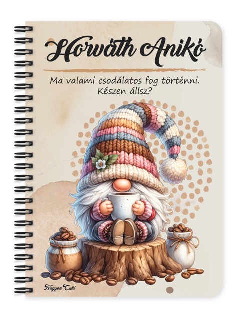 Névvel & Idézettel Kérhető - Kávés manó csüccs Mintás Füzet | Egyedi Ajándék Kávéimádóknak & Személyre Szabható Manós Füzet | nagyoncuki.hu Képzeld el, hogy a reggeli kávéd illata mellett ott lapul az asztalodon egy végtelenül cuki, személyre szabott füzet, aminek a borítóján a te neved és egy neked szóló, inspiráló üzenet köszönt! Ez a kávés manó mintás füzet nem csupán egy jegyzetfüzet – ő egy vidám társ a mindennapokhoz, egy motivációs lökés a borús reggeleken, és egy igazán szívhez szóló, egyedi ajándék minden kávérajongónak. Ez a kis cuki manó a gőzölgő kávéscsészéjével a hygge életérzést, a nyugodt reggeleket és a kreatív energiákat testesíti meg. Tökéletes választás, ha egy kis vidámságot és rendszert szeretnél csempészni a napjaidba. Legyen szó a napi teendők listájáról, egyetemi jegyzetekről vagy egy új projekt tervezéséről, ez a manós füzet garantáltan mosolyt csal az arcodra. A dizájn kedves és egyedi, így kiváló ajándék ötlet azoknak, akik imádják a kávét és a személyes meglepetéseket. Ezt a bájos füzetet mi magunk, a nagyoncuki.hu csapata terveztük, így biztos lehetsz benne, hogy egy igazán különleges, magyar dizájnnal készült darabbal leped meg szeretteidet vagy magadat! :)