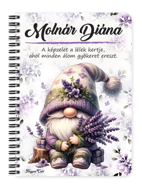 Névvel & Idézettel Kérhető - Cuki Levendulás manó mintás Füzet | Egyedi Ajándék Kávéimádóknak & Személyre Szabható Manós Füzet | nagyoncuki.hu Képzeld el, ahogy egy hosszú nap után leülsz egy csendes sarokba, a levegőben finom levendulaillat száll, a kezedben pedig ez a gyönyörű, személyre szabott füzet pihen, ami csak arra vár, hogy megtöltsd a legszebb gondolataiddal, álmaiddal vagy a hálanaplód bejegyzéseivel. Ez a levendulás manó mintás füzet több, mint egy jegyzetfüzet – egy apró sziget a béke és a nyugalom tengerén, a kreatív elmélyülés hűséges társa. Ez a lila süveges, levendulacsokrot ölelő kis manó a harmónia, a stresszmentes pillanatok és a kreatív ábrándozás szimbóluma. Tökéletes választás, ha szeretnéd lelassítani a rohanó hétköznapokat és egy kis énidőt szentelnél magadnak. Ideális naplóíráshoz, versekhez, pozitív megerősítésekhez vagy a napi gondolatok rendezéséhez. A dizájn finom és lélekemelő, így kiváló ajándék ötlet azoknak, akik értékelik a természet szépségét és a szívhez szóló, személyes meglepetéseket. Ezt a bájos füzetet mi magunk, a nagyoncuki.hu csapata terveztük, így biztos lehetsz benne, hogy egy igazán különleges, magyar dizájnnal készült darabbal leped meg szeretteidet vagy magadat! :)