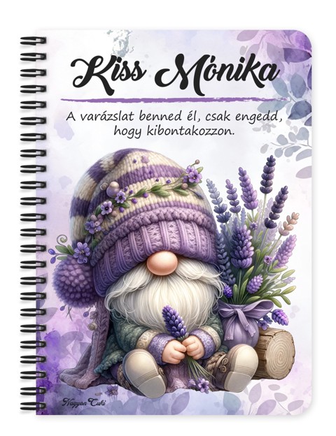 Névvel & Idézettel Kérhető - Tündéri Levendulás manó mintás Füzet | Egyedi Ajándék Kávéimádóknak & Személyre Szabható Manós Füzet | nagyoncuki.hu Képzeld el, ahogy egy hosszú nap után leülsz egy csendes sarokba, a levegőben finom levendulaillat száll, a kezedben pedig ez a gyönyörű, személyre szabott füzet pihen, ami csak arra vár, hogy megtöltsd a legszebb gondolataiddal, álmaiddal vagy a hálanaplód bejegyzéseivel. Ez a levendulás manó mintás füzet több, mint egy jegyzetfüzet – egy apró sziget a béke és a nyugalom tengerén, a kreatív elmélyülés hűséges társa. Ez a lila süveges, levendulacsokrot ölelő kis manó a harmónia, a stresszmentes pillanatok és a kreatív ábrándozás szimbóluma. Tökéletes választás, ha szeretnéd lelassítani a rohanó hétköznapokat és egy kis énidőt szentelnél magadnak. Ideális naplóíráshoz, versekhez, pozitív megerősítésekhez vagy a napi gondolatok rendezéséhez. A dizájn finom és lélekemelő, így kiváló ajándék ötlet azoknak, akik értékelik a természet szépségét és a szívhez szóló, személyes meglepetéseket. Ezt a bájos füzetet mi magunk, a nagyoncuki.hu csapata terveztük, így biztos lehetsz benne, hogy egy igazán különleges, magyar dizájnnal készült darabbal leped meg szeretteidet vagy magadat! :)