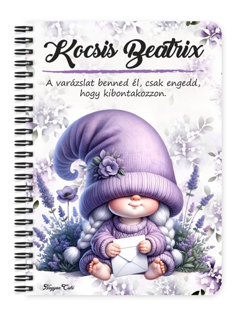 Névvel & Idézettel Kérhető - Cuki levendulás manólány levéllel mintás Füzet | Egyedi Ajándék Kávéimádóknak & Személyre Szabható Manós Füzet | nagyoncuki.hu Képzeld el, ahogy egy hosszú nap után leülsz egy csendes sarokba, a levegőben finom levendulaillat száll, a kezedben pedig ez a gyönyörű, személyre szabott füzet pihen, ami csak arra vár, hogy megtöltsd a legszebb gondolataiddal, álmaiddal vagy a hálanaplód bejegyzéseivel. Ez a levendulás manó mintás füzet több, mint egy jegyzetfüzet – egy apró sziget a béke és a nyugalom tengerén, a kreatív elmélyülés hűséges társa. Ez a lila süveges, levendulacsokrot ölelő kis manó a harmónia, a stresszmentes pillanatok és a kreatív ábrándozás szimbóluma. Tökéletes választás, ha szeretnéd lelassítani a rohanó hétköznapokat és egy kis énidőt szentelnél magadnak. Ideális naplóíráshoz, versekhez, pozitív megerősítésekhez vagy a napi gondolatok rendezéséhez. A dizájn finom és lélekemelő, így kiváló ajándék ötlet azoknak, akik értékelik a természet szépségét és a szívhez szóló, személyes meglepetéseket. Ezt a bájos füzetet mi magunk, a nagyoncuki.hu csapata terveztük, így biztos lehetsz benne, hogy egy igazán különleges, magyar dizájnnal készült darabbal leped meg szeretteidet vagy magadat! :)