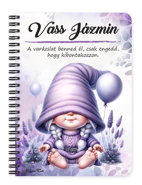 Névvel & Idézettel Kérhető - Lufis levendulás manólány mintás Füzet | Egyedi Ajándék Kávéimádóknak & Személyre Szabható Manós Füzet | nagyoncuki.hu Képzeld el, ahogy egy hosszú nap után leülsz egy csendes sarokba, a levegőben finom levendulaillat száll, a kezedben pedig ez a gyönyörű, személyre szabott füzet pihen, ami csak arra vár, hogy megtöltsd a legszebb gondolataiddal, álmaiddal vagy a hálanaplód bejegyzéseivel. Ez a levendulás manó mintás füzet több, mint egy jegyzetfüzet – egy apró sziget a béke és a nyugalom tengerén, a kreatív elmélyülés hűséges társa. Ez a lila süveges, levendulacsokrot ölelő kis manó a harmónia, a stresszmentes pillanatok és a kreatív ábrándozás szimbóluma. Tökéletes választás, ha szeretnéd lelassítani a rohanó hétköznapokat és egy kis énidőt szentelnél magadnak. Ideális naplóíráshoz, versekhez, pozitív megerősítésekhez vagy a napi gondolatok rendezéséhez. A dizájn finom és lélekemelő, így kiváló ajándék ötlet azoknak, akik értékelik a természet szépségét és a szívhez szóló, személyes meglepetéseket. Ezt a bájos füzetet mi magunk, a nagyoncuki.hu csapata terveztük, így biztos lehetsz benne, hogy egy igazán különleges, magyar dizájnnal készült darabbal leped meg szeretteidet vagy magadat! :)