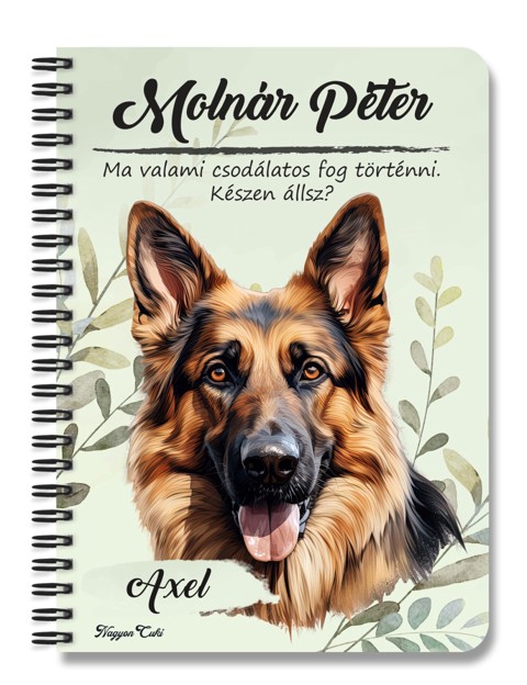 Névvel & Idézettel Kérhető - Németjuhász portré kutyás Füzet | Egyedi Ajándék Kutyásoknak & Személyre Szabható Kutyás Ajándék | nagyoncuki.hu Minden gazdi tudja, hogy a saját kutyusa a legszebb, legokosabb és legszerethetőbb a világon. Mostantól ezt a büszkeséget és szeretetet magaddal viheted mindenhová ezzel a stílusos, személyre szabható füzettel, amit kedvenc négylábúd portréja díszít. Ez a füzet nemcsak egy egyszerű jegyzetfüzet, hanem egy igazi tisztelgés a gazdi és kutyája közötti különleges kötelék előtt. A portré hűen és szeretettel ragadja meg a Németjuhász fajta jellegzetes báját és karakterét. Tökéletes választás, ha szeretnéd a legfontosabb jegyzeteidet, terveidet vagy a kutyás kalandjaitok emlékeit egy olyan füzetbe írni, ami igazán közel áll a szívedhez. Legyen szó a kutyaovi emlékeiről, a tréning jegyzeteiről vagy a napi teendőkről, ez a kutyaportrés füzet garantáltan a kedvenced lesz.