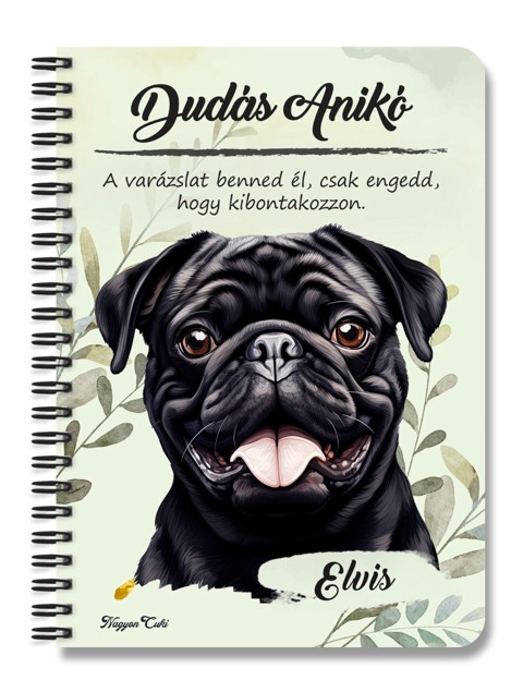 Névvel & Idézettel Kérhető - Fekete mopsz portré kutyás Füzet | Egyedi Ajándék Kutyásoknak & Személyre Szabható Kutyás Ajándék | nagyoncuki.h Minden gazdi tudja, hogy a saját kutyusa a legszebb, legokosabb és legszerethetőbb a világon. Mostantól ezt a büszkeséget és szeretetet magaddal viheted mindenhová ezzel a stílusos, személyre szabható füzettel, amit kedvenc négylábúd portréja díszít. Ez a füzet nemcsak egy egyszerű jegyzetfüzet, hanem egy igazi tisztelgés a gazdi és kutyája közötti különleges kötelék előtt. A portré hűen és szeretettel ragadja meg a Fekete mopsz fajta jellegzetes báját és karakterét. Tökéletes választás, ha szeretnéd a legfontosabb jegyzeteidet, terveidet vagy a kutyás kalandjaitok emlékeit egy olyan füzetbe írni, ami igazán közel áll a szívedhez. Legyen szó a kutyaovi emlékeiről, a tréning jegyzeteiről vagy a napi teendőkről, ez a kutyaportrés füzet garantáltan a kedvenced lesz.