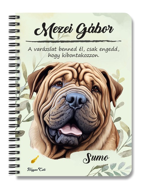 Névvel & Idézettel Kérhető - Sharpei portré kutyás Füzet | Egyedi Ajándék Kutyásoknak & Személyre Szabható Kutyás Ajándék | nagyoncuki.h Minden gazdi tudja, hogy a saját kutyusa a legszebb, legokosabb és legszerethetőbb a világon. Mostantól ezt a büszkeséget és szeretetet magaddal viheted mindenhová ezzel a stílusos, személyre szabható füzettel, amit kedvenc négylábúd portréja díszít. Ez a füzet nemcsak egy egyszerű jegyzetfüzet, hanem egy igazi tisztelgés a gazdi és kutyája közötti különleges kötelék előtt. A portré hűen és szeretettel ragadja meg a Sharpei fajta jellegzetes báját és karakterét. Tökéletes választás, ha szeretnéd a legfontosabb jegyzeteidet, terveidet vagy a kutyás kalandjaitok emlékeit egy olyan füzetbe írni, ami igazán közel áll a szívedhez. Legyen szó a kutyaovi emlékeiről, a tréning jegyzeteiről vagy a napi teendőkről, ez a kutyaportrés füzet garantáltan a kedvenced lesz.