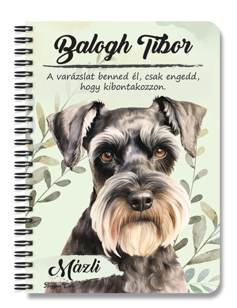 Névvel & Idézettel Kérhető - Törpe schnauzer portré kutyás Füzet | Egyedi Ajándék Kutyásoknak & Személyre Szabható Kutyás Ajándék | nagyoncuki.h Minden gazdi tudja, hogy a saját kutyusa a legszebb, legokosabb és legszerethetőbb a világon. Mostantól ezt a büszkeséget és szeretetet magaddal viheted mindenhová ezzel a stílusos, személyre szabható füzettel, amit kedvenc négylábúd portréja díszít. Ez a füzet nemcsak egy egyszerű jegyzetfüzet, hanem egy igazi tisztelgés a gazdi és kutyája közötti különleges kötelék előtt. A portré hűen és szeretettel ragadja meg a Törpe schnauzer fajta jellegzetes báját és karakterét. Tökéletes választás, ha szeretnéd a legfontosabb jegyzeteidet, terveidet vagy a kutyás kalandjaitok emlékeit egy olyan füzetbe írni, ami igazán közel áll a szívedhez. Legyen szó a kutyaovi emlékeiről, a tréning jegyzeteiről vagy a napi teendőkről, ez a kutyaportrés füzet garantáltan a kedvenced lesz.